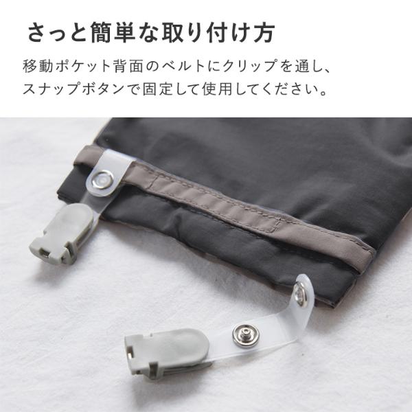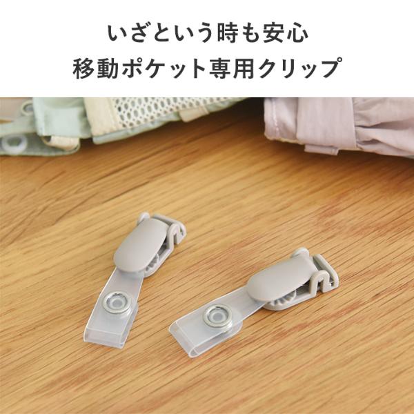 - 移動ポケットをお洋服に付けるときに使う、クリップ2個セット。お気に入りのポケットはそのまま、クリップだけ付け替えていただけます。