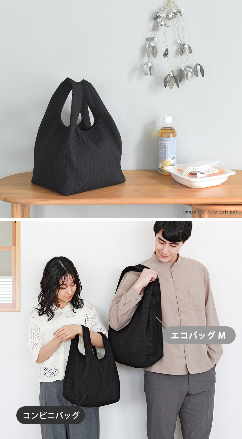 たっぷり買う日は、サイズ違いで2つ使いこちらのシリーズは全3サイズ展開。買い物の量が多い日は、こちらのコンビニバッグと合わせてワンサイズ大きい「エコバッグM」を使えば、ちょうどよく収まります。