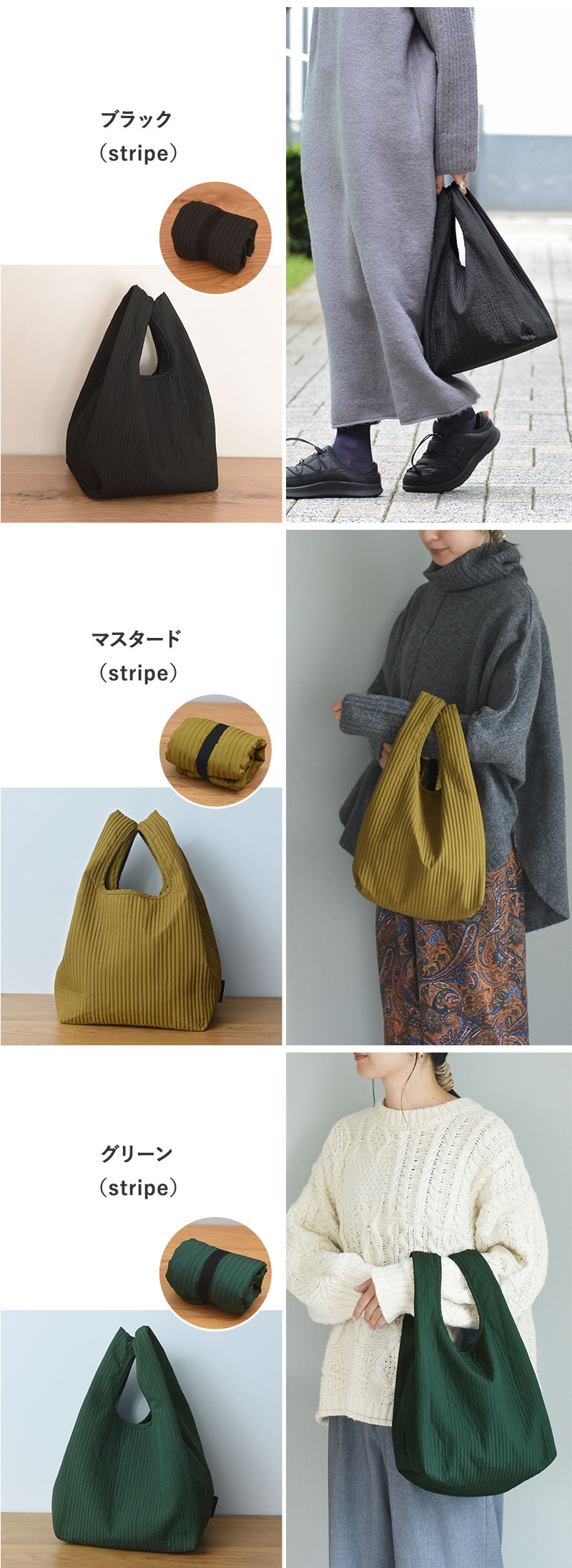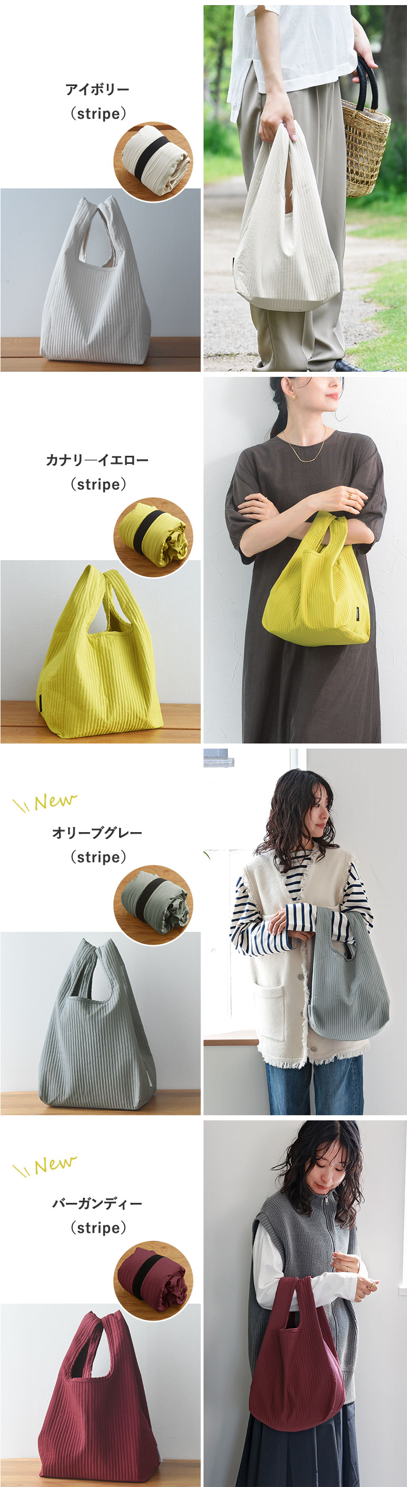 通勤や街歩きのサブバッグとしてもご好評いただいているストライプ調の素材に、秋冬新色の「オリーブグレー」と「バーガンディー」が仲間入りしました。