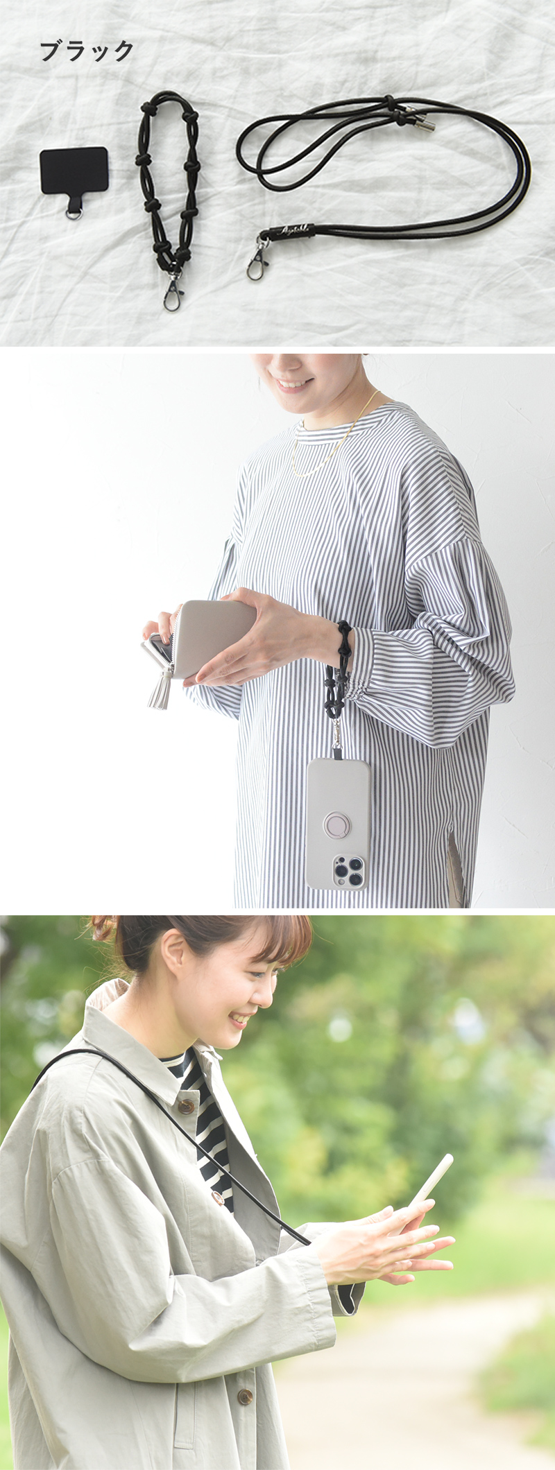 短い方のスマホストラップは手首に、長い方は首や肩に下げられて、スマホの落下防止だけでなく、手が空いて荷物を持ったりすることも。スマホをバッグの中にしまい込まないので、キャッシュレス決済やポイントアプリを開く時、サッと写真を撮りたい時にも便利です。