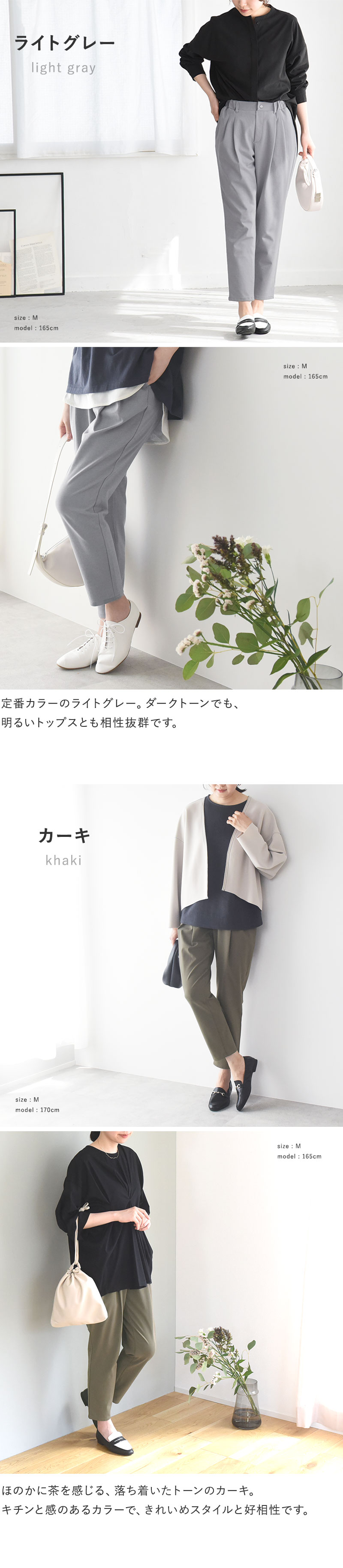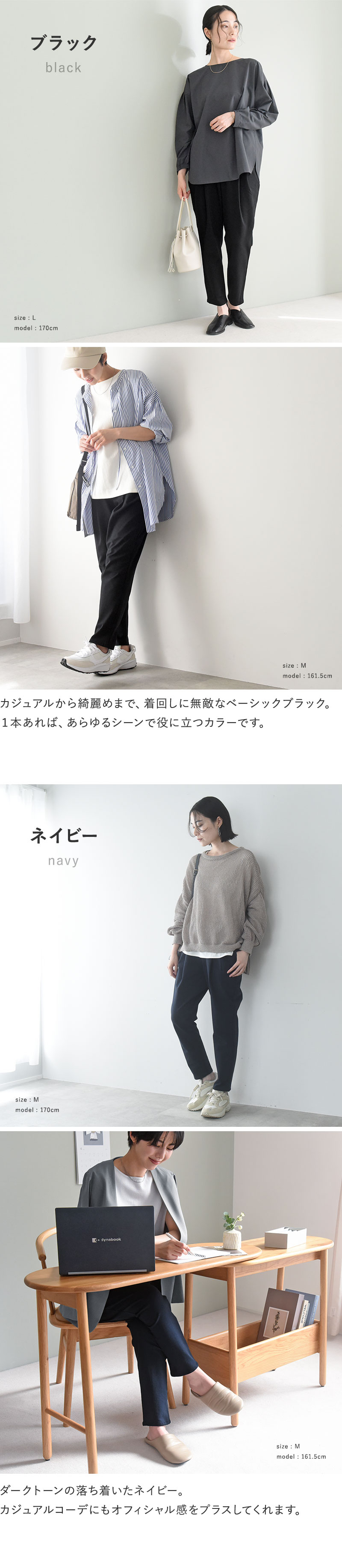 締め付け感ゼロ、手抜き感もゼロ。動きに合わせ伸縮する、360°ストレッチ生地の履き心地だけでなく、下半身コンプレックスを安心させてくれる緩やかテーパードライン、そして洗濯機で洗える日々のケアのしやすさまで網羅。