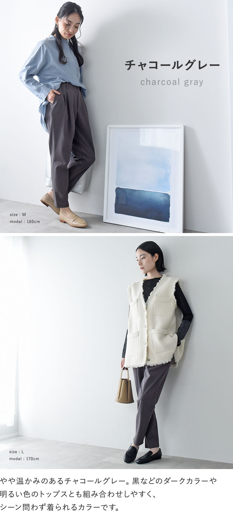 また、フロントに入った2本のタックが、お腹を目眩まししながら、縦長のすっきりとしたラインを演出してくれます。