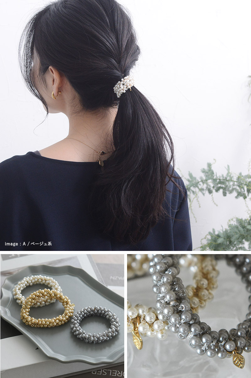 パールタイプ華やかなパールを編み上げたヘアゴムは、結ぶだけで上品な印象に。入卒園などのセレモニーシーンにもぴったり、さりげないゴールドの葉のモチーフがポイントです。