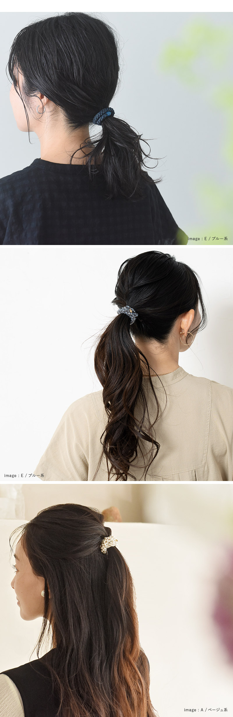 B/グレー系クールな印象の3種類。(グレーパール、ブラック×シルバーラメ、ブラック)髪色が暗めの方、シンプルなスタイルが多い方に。