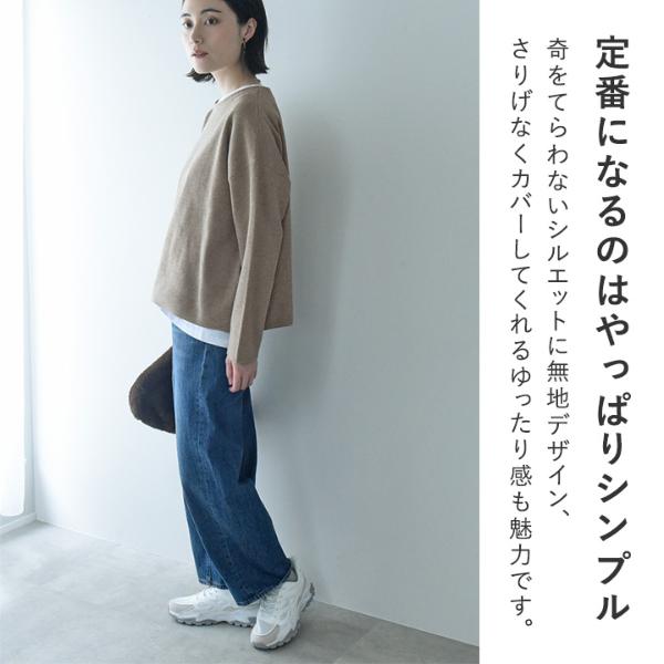 定番アイテムとして一枚は持っておきたいシンプルなお洋服。こちらは、奇をてらわないシルエットに無地デザイン、さりげなくカバーしてくれるゆったり感も魅力です。