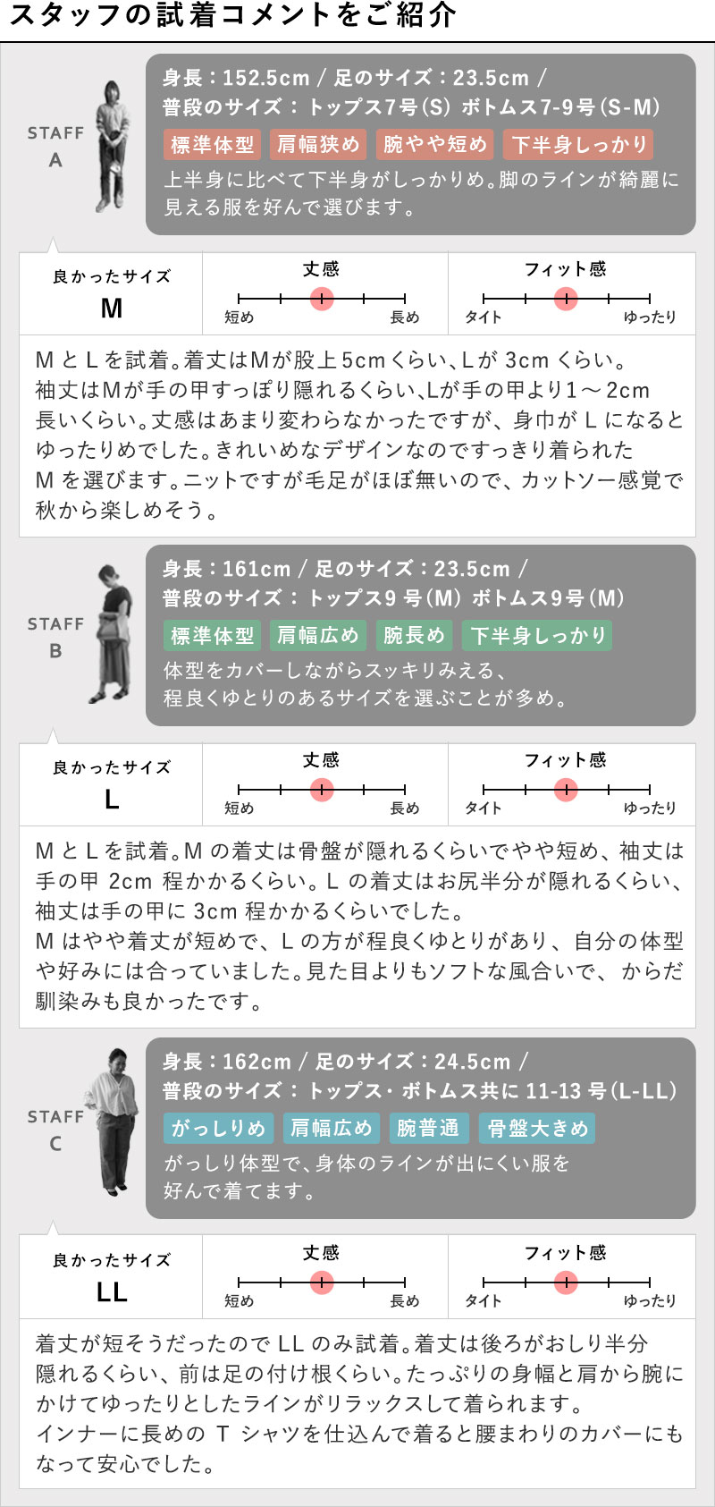 異なる身長のスタッフが着用してみました。サイズ感やコーディネートのご参考にどうぞ。
