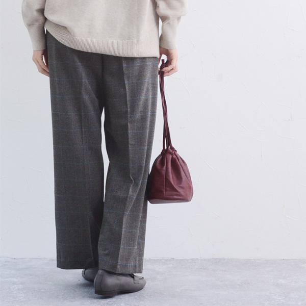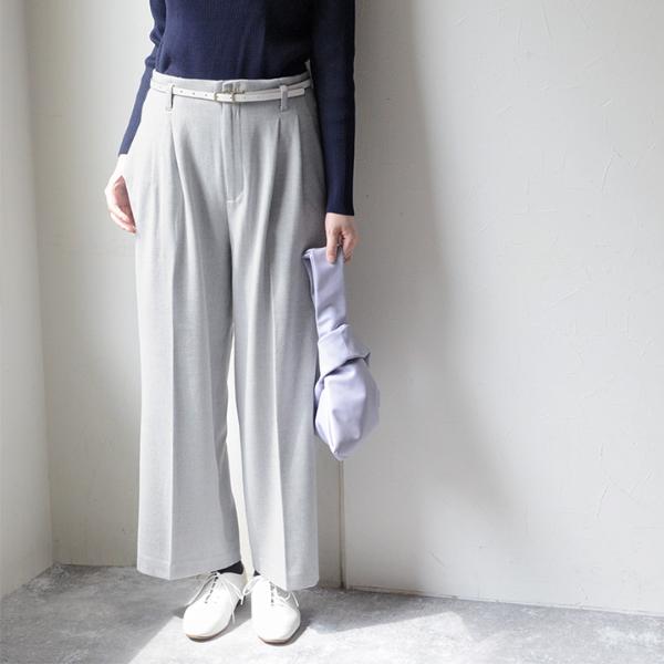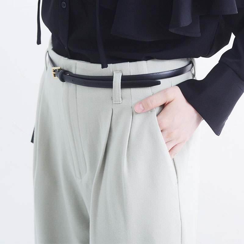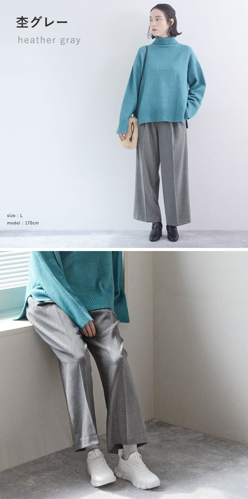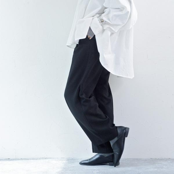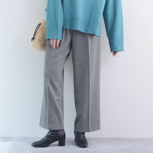 両面とも微起毛した素材を使ったタックパンツは、寒い日に足を通した時もヒヤっとせず、素肌にもやわらかな穿き心地。