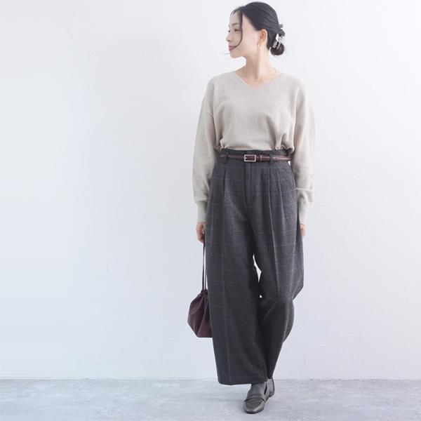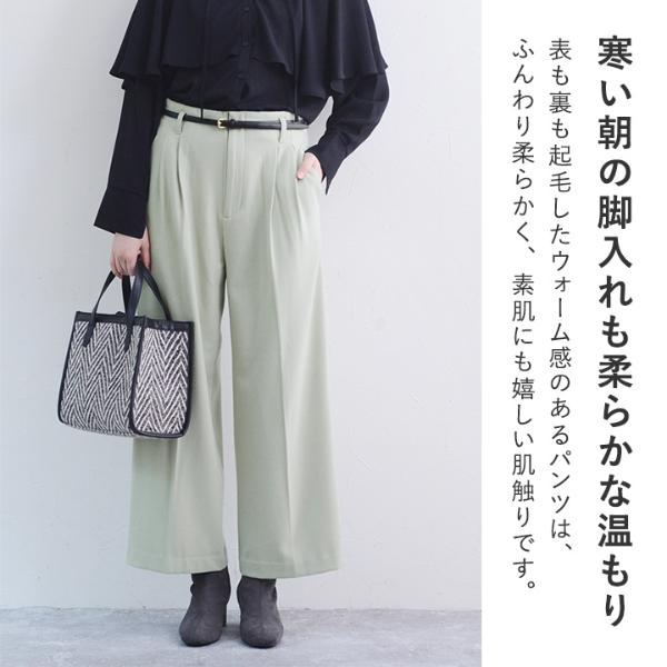- 表地も裏地も微起毛のパンツ。素肌にも暖かく、秋冬コーデにぴったりです。タックが2つ入っているので着やせ効果も◎。ワイドシルエットで動きやすさも抜群です。