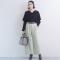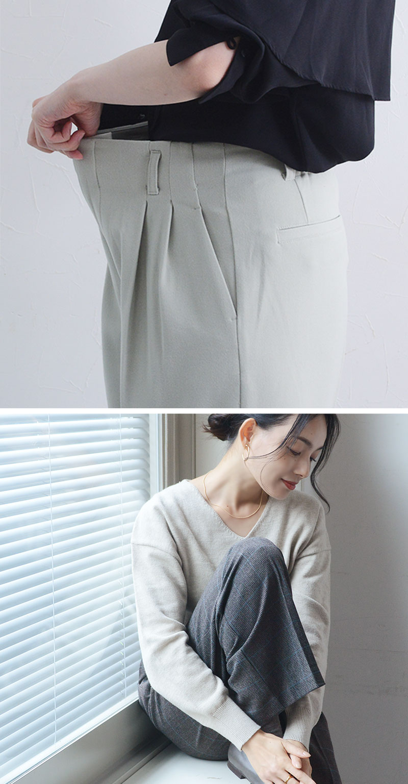タックが2つ入ったデザインで縦のラインを強調。お腹や腰回りにゆとりが生まれるのでスッキリ見えが叶います。