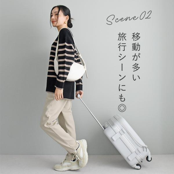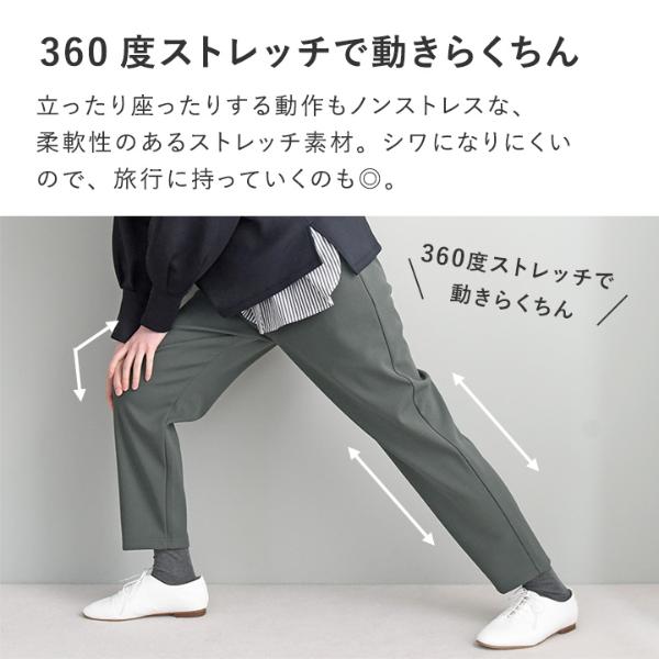 立ったり座ったりする動作もノンストレスな、柔軟性のあるストレッチ素材。シワになりにくいので、旅行に持っていくのも◎。レジャーなどアクティブなシーンでも大活躍です。