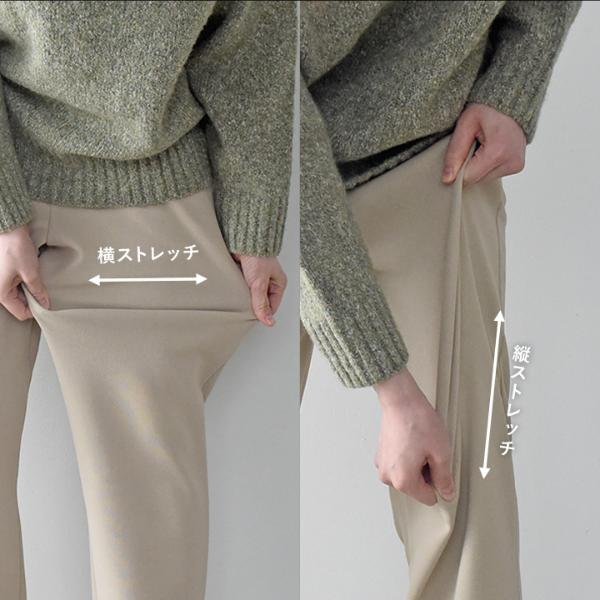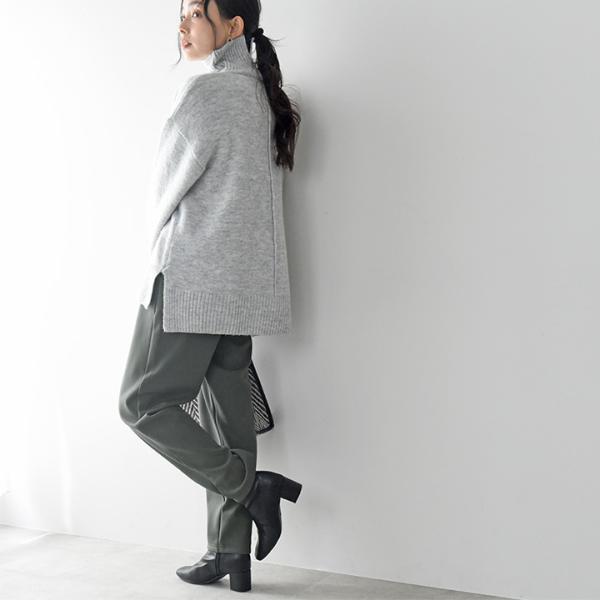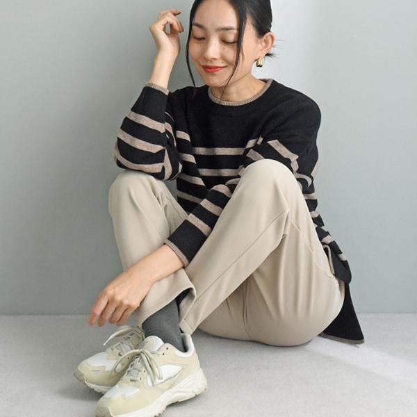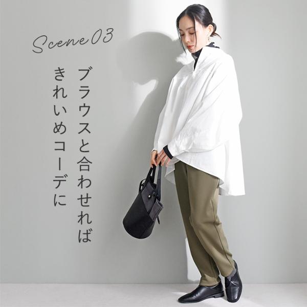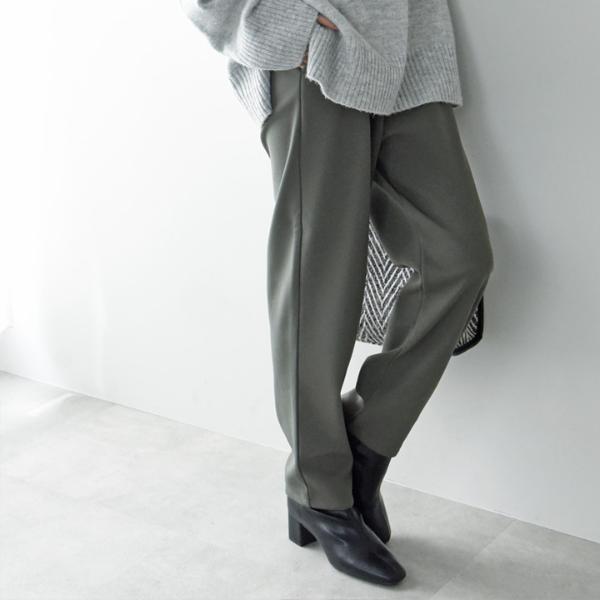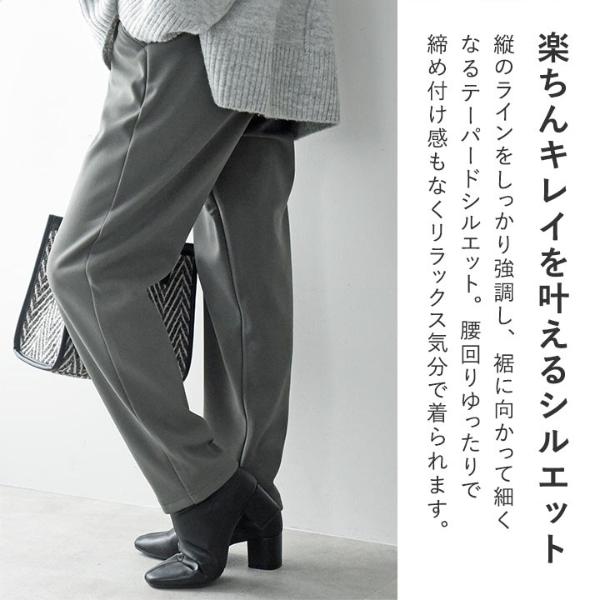 縦のラインをしっかり強調し、裾に向かって細くなるテーパードシルエット。腰回りゆったりで締め付け感もなくリラックス気分で着られます。縦ラインが強調されることで美脚効果も。
