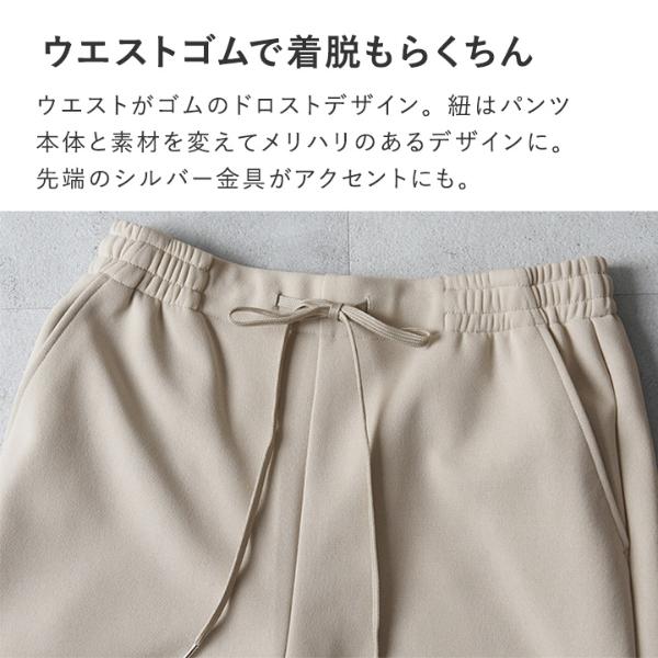 さらにウエストがゴムのドロストデザインなので着脱もらくちん。タック入りなので腰回りにゆとりが生まれ、動きやすさも抜群です。紐はパンツ本体と素材を変えてすっきりメリハリのあるデザインに。先端のシルバー金具がアクセントにも。