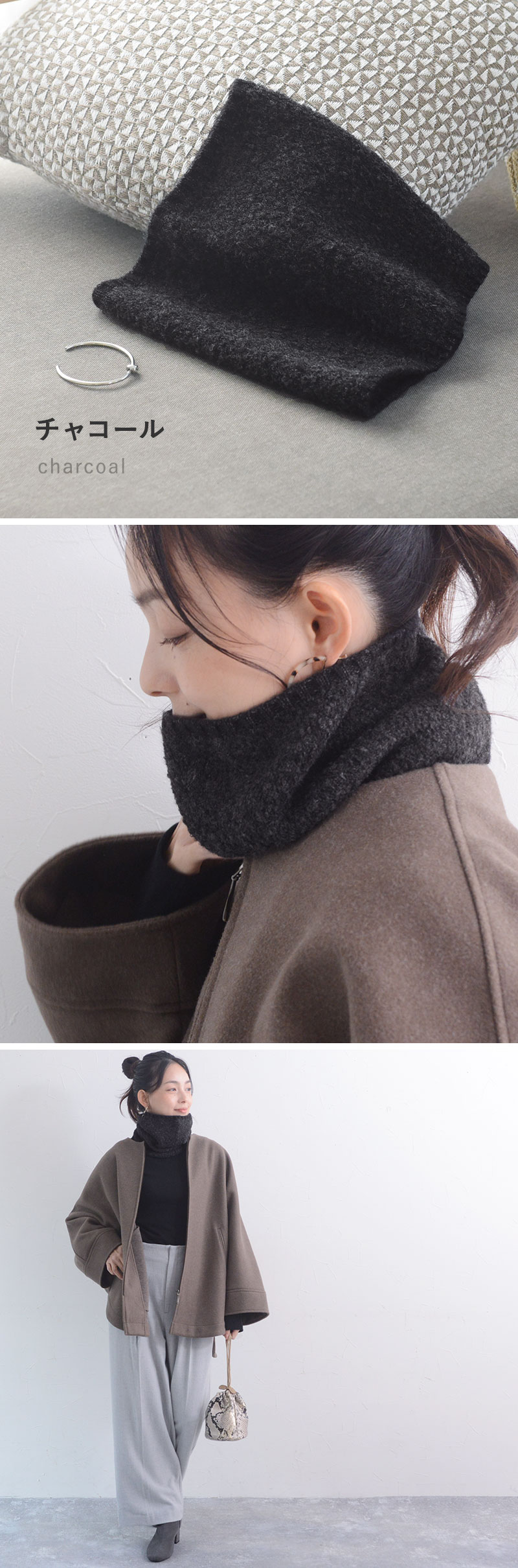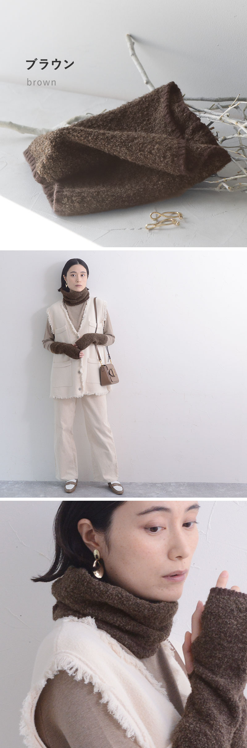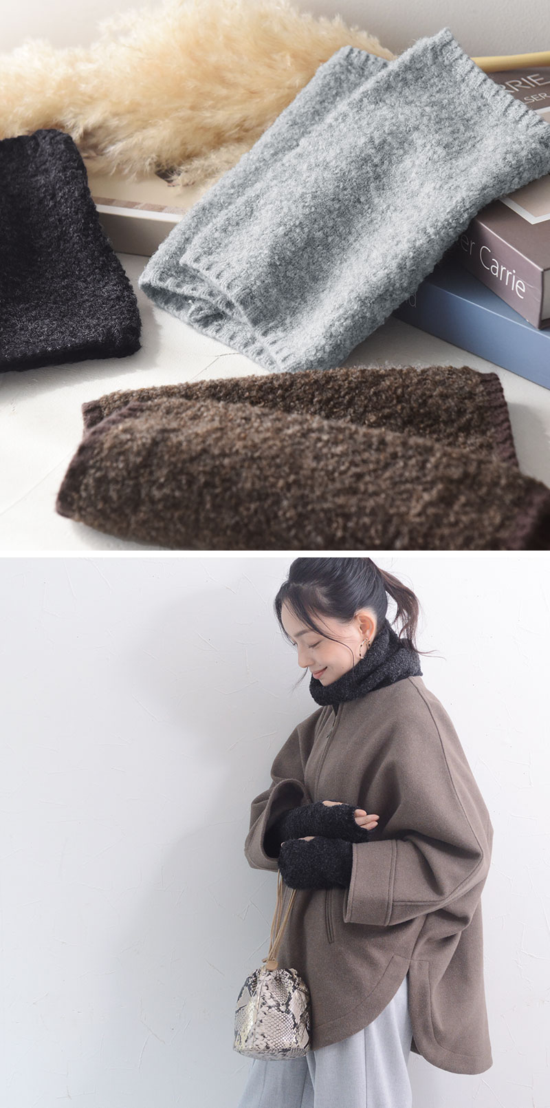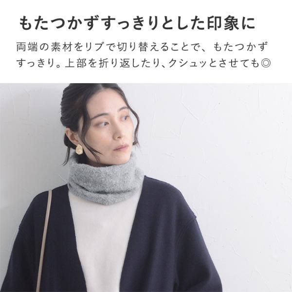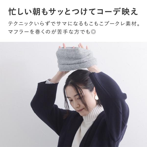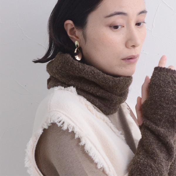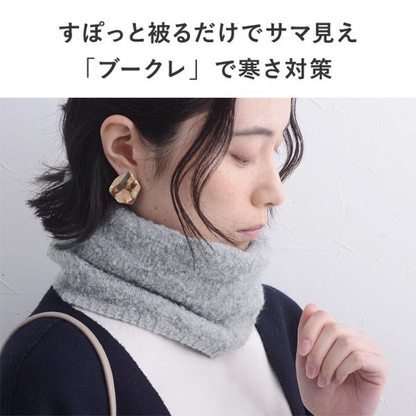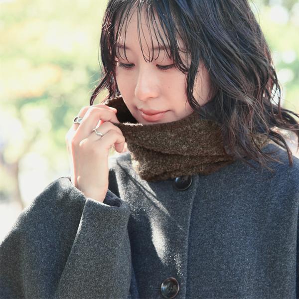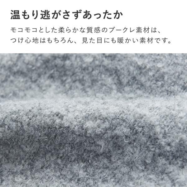 - 温もり逃がさずあったかい、ニット見えのネックウォーマーです。もこもこブークレ素材でウォーム感たっぷり。防寒しながら冬のおしゃれを叶えます。