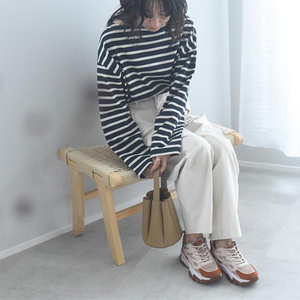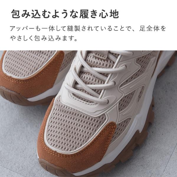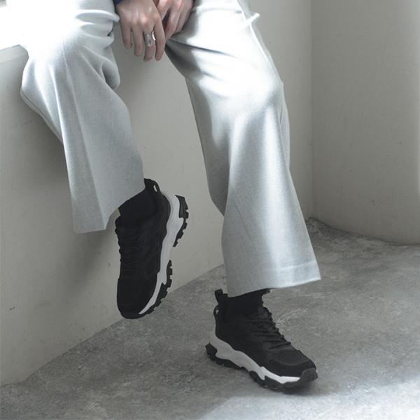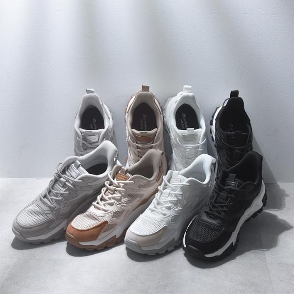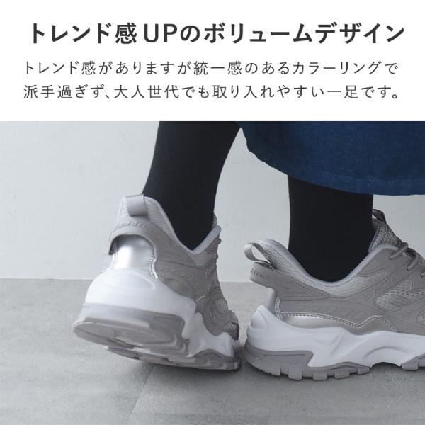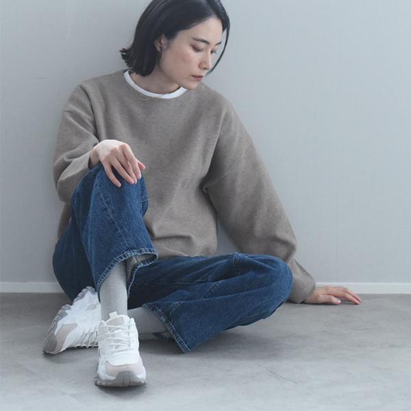 異素材を組み合わせたアッパーや、ボリュームのあるアウトソールで旬をまとったデザイン。トレンド感がありますが統一感のあるカラーリングで派手過ぎず、大人世代も取り入れやすい一足です。