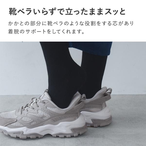 かかとの部分には靴ベラのような役割をする芯があり、着脱のサポートをしてくれます。また、かかとをしっかりホールドすることで、足の安定感を高め、疲れにくい設計になっています。
