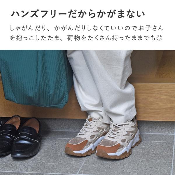 しゃがんだり、かがんだりする必要がなく、ハンズフリーでサッと履けるので、お子さんを抱っこしたまま、荷物をたくさん持ったままでもスムーズに履くことができます。