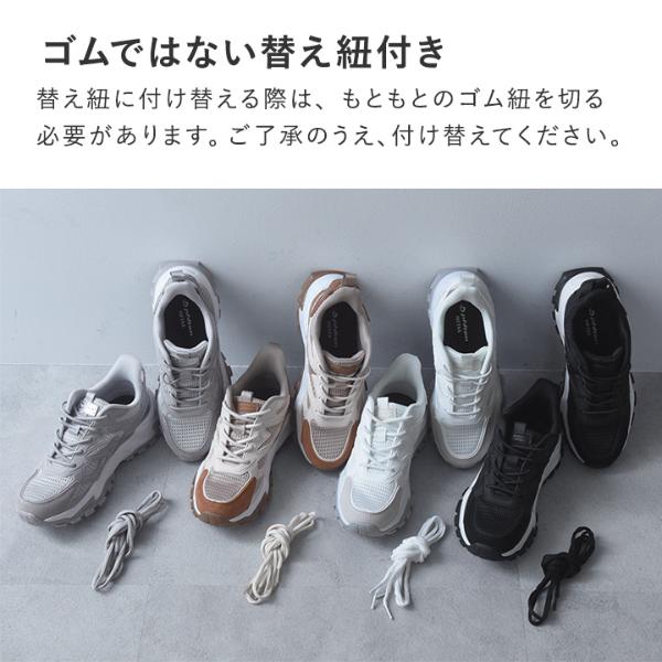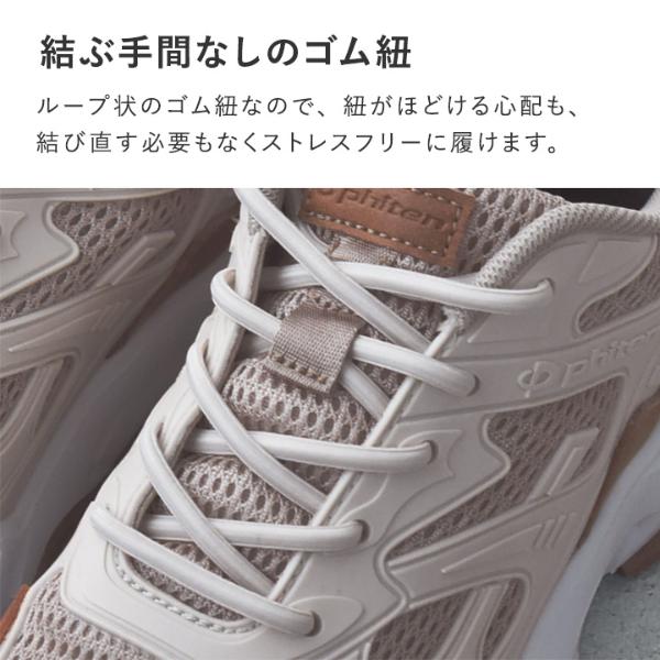 結ぶ手間なしのゴム紐正面から見た時にループ状のゴム紐がアクセントに。また、紐がほどける心配も、結び直す必要もないのでストレスフリーに履いていただけます。