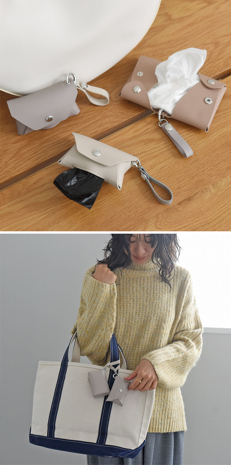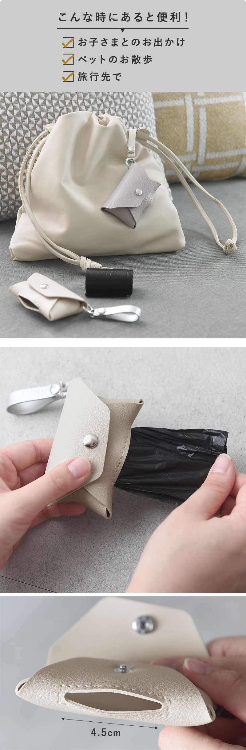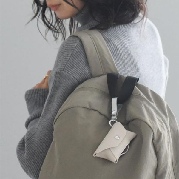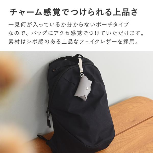そのまま持って出かけるとどうしても生活感が出てしまうゴミ袋。こちらは一見何が入っているか分からないポーチタイプなので、バッグにアクセ感覚でつけていただけます。