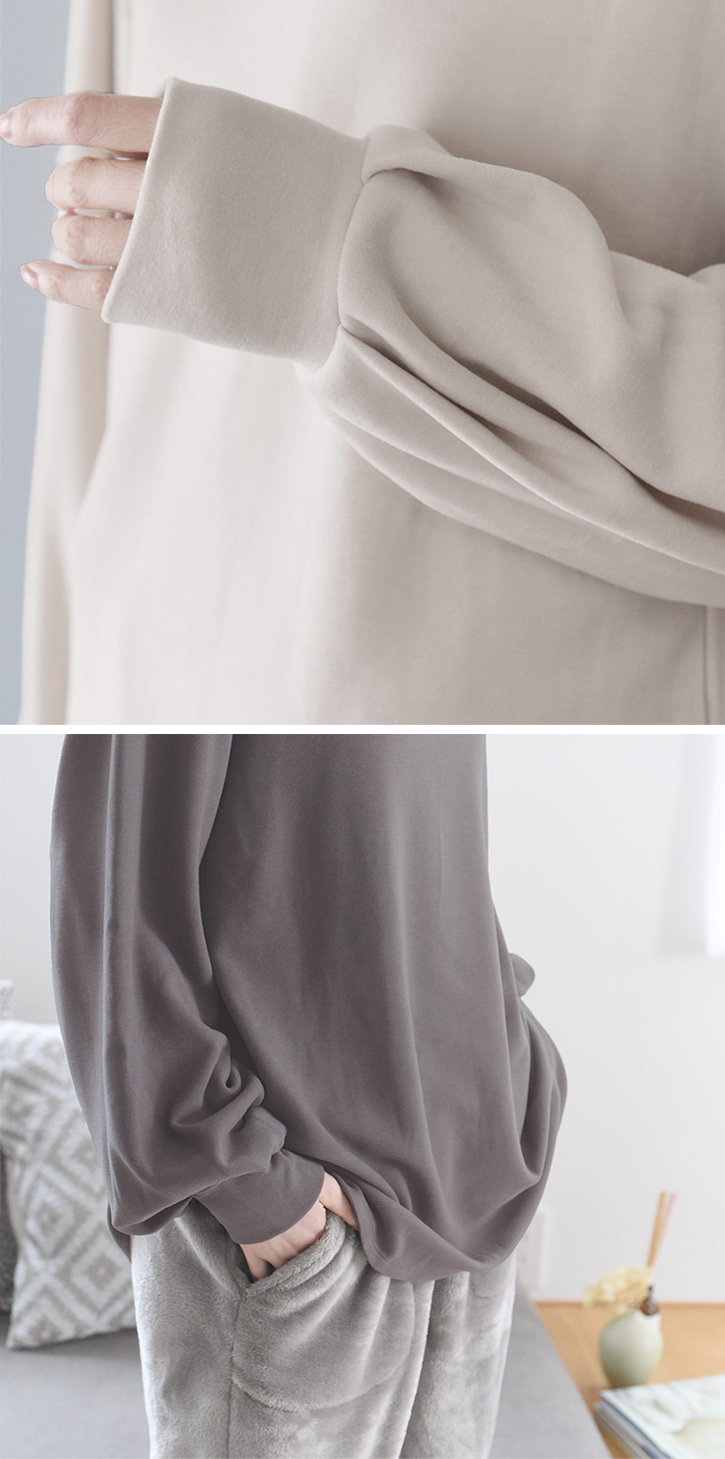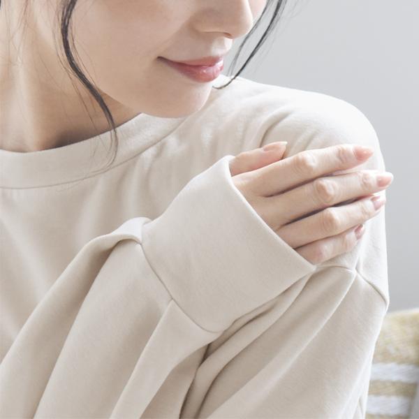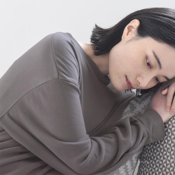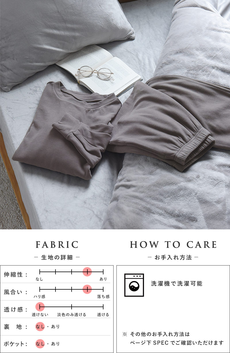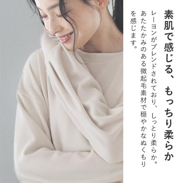 着心地が良いことはルームウェア選びで大切なポイント。こちらは、レーヨンがブレンドされていることでしっとり柔らかな肌心地。また、あたたかみのある微起毛素材で穏やかなぬくもりを感じます。