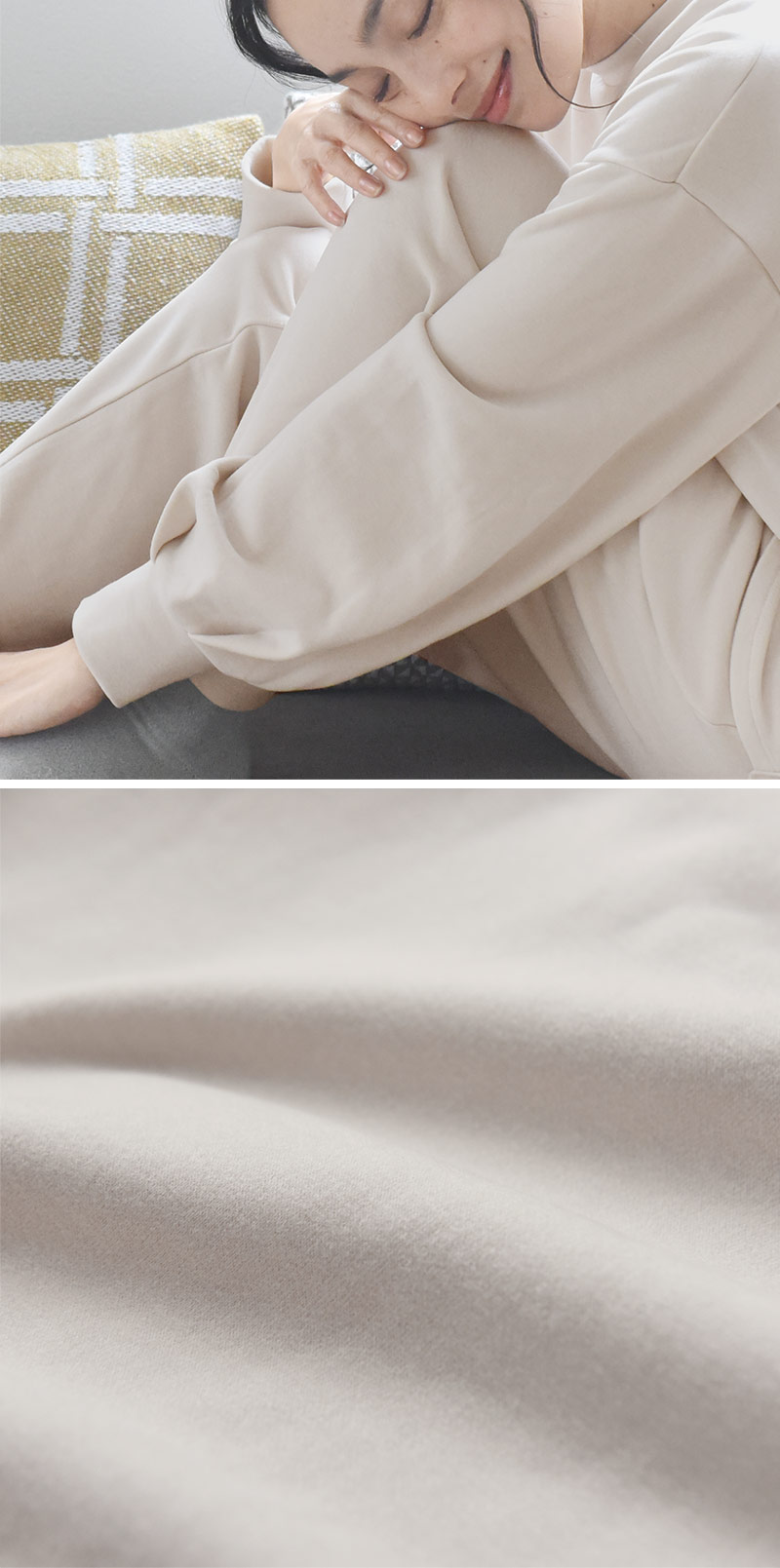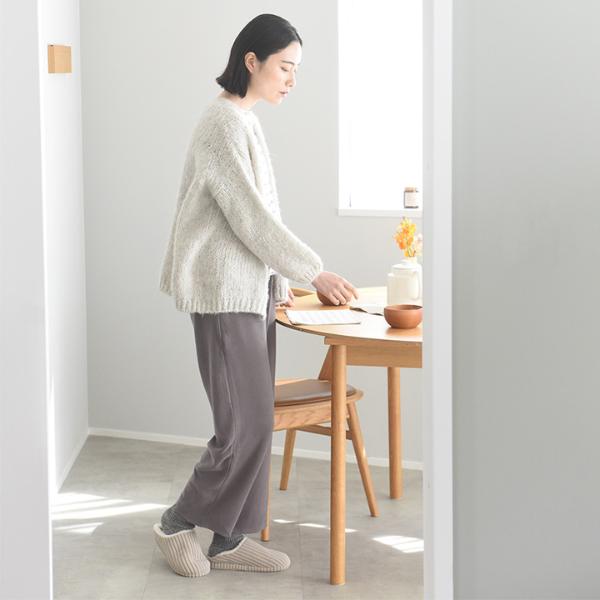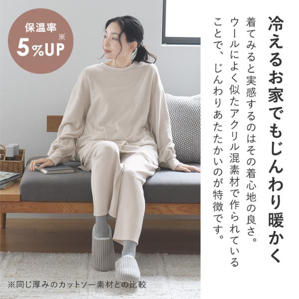 シンプルなルームウェアですが、着てみると実感するのはその着心地の良さ。ウールによく似たアクリル混素材で作られていることで、じんわりあたたかいのが特徴です。