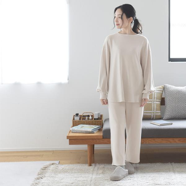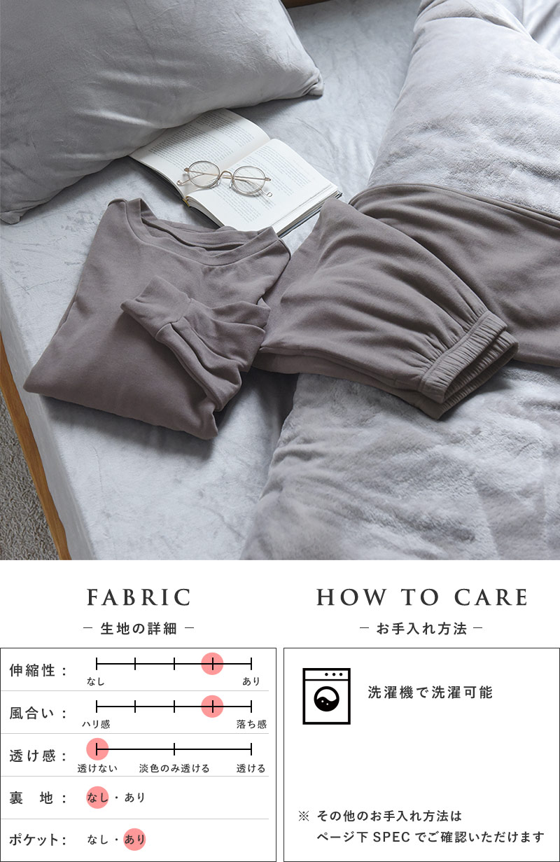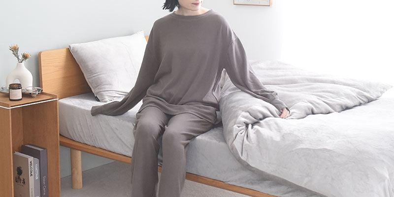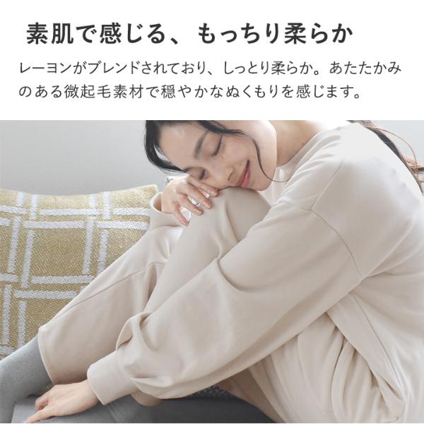 着心地が良いことはルームウェア選びで大切なポイント。こちらは、レーヨンがブレンドされていることでしっとり柔らかな肌心地。また、あたたかみのある微起毛素材で穏やかなぬくもりを感じます。