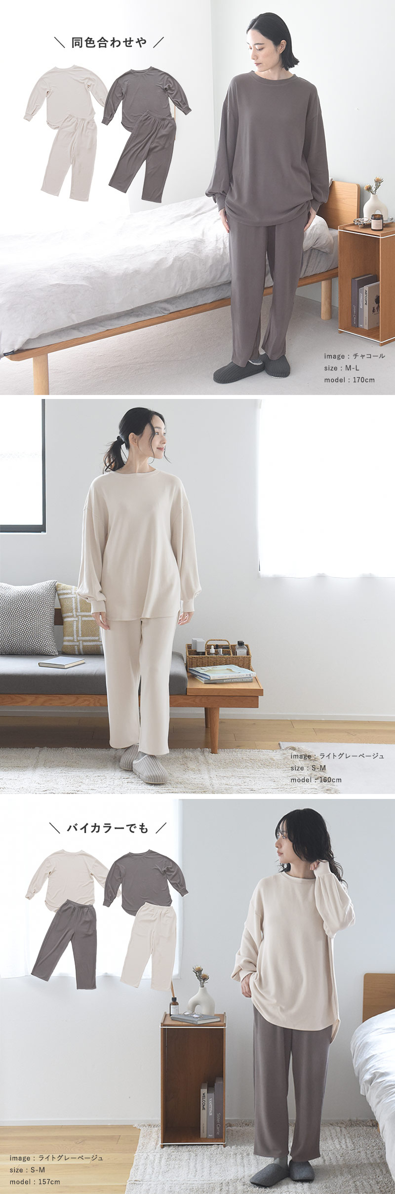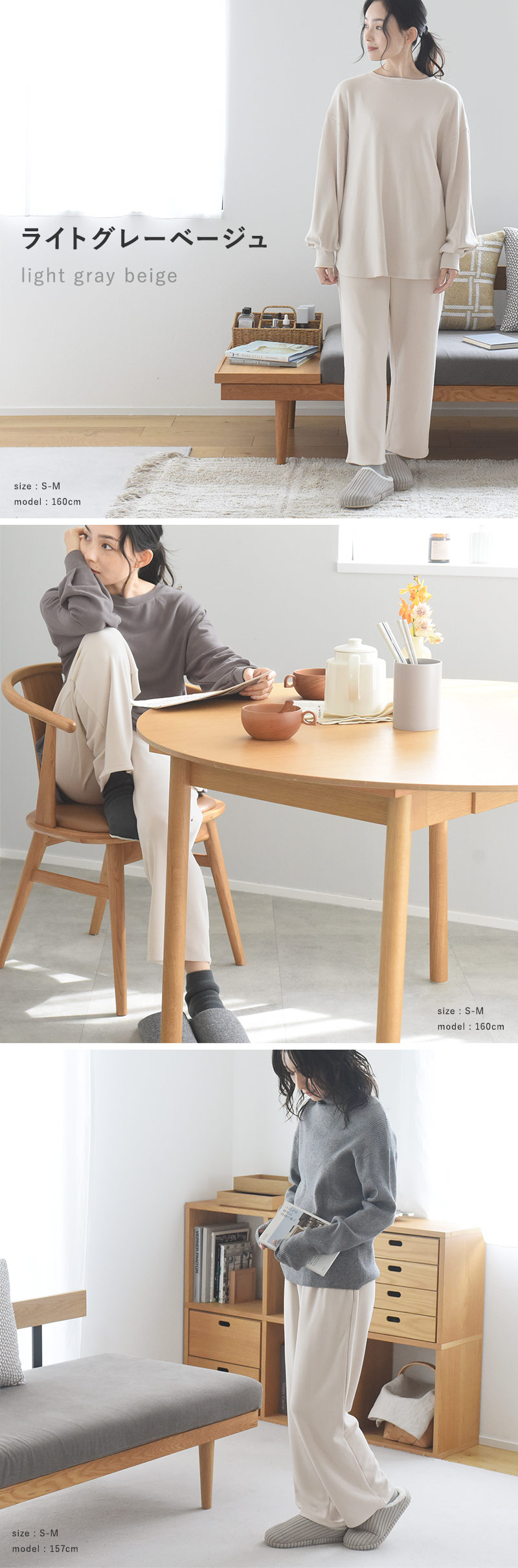 同素材のチュニックとセットアップ使いも◎。同色で揃えるのも、あえて違う色であわせてもOK。ふんわりあたたかなウェアで上下を揃えればさらに心地よく過ごせそうです。