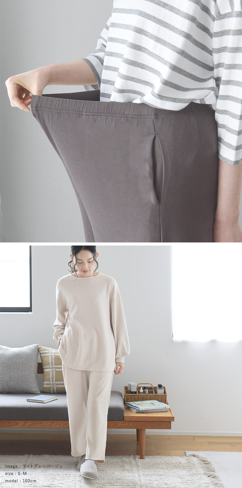 ストレッチが効いている素材なので立ったり座ったり、寝ころんだりするのもストレスなし。窮屈感もありません。