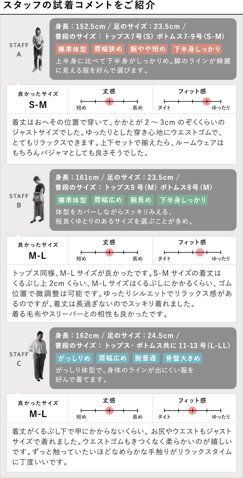 シルエットの好みや、体型に合わせて選べる2サイズをご用意。サイズ選びの際は、スタッフの試着コメントもぜひご参考ください。