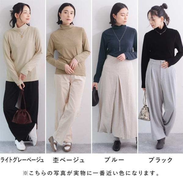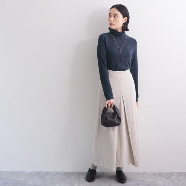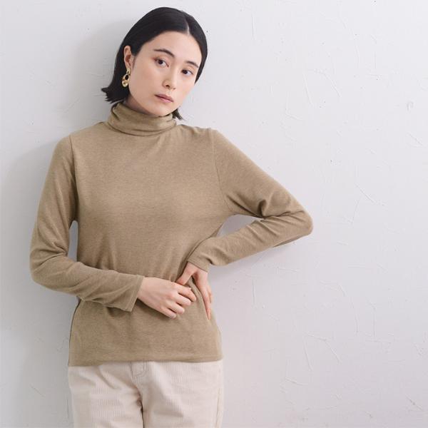 - しっとり柔らかな肌触りに思わずうっとりする、吸湿発熱加工つきハイネックカットソー。コットンやレーヨンを混紡していることで、なめらかな着心地を実現しています。