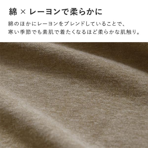 綿×レーヨンで柔らかに綿のほかにもレーヨンをブレンドしていることで、寒い季節でも素肌で着たくなるほど柔らかな肌触りに。また、ストレッチが効いているので着心地も抜群です。