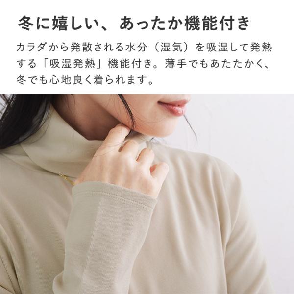冬に嬉しい、あったか機能付きカラダから発散される水分(湿気)を吸湿して発熱する「吸湿発熱」機能付き。加工が施されていることで、薄手でもあたたかく、冬でも心地良く着られます。