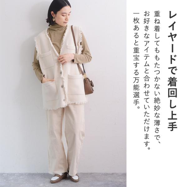 レイヤードで着回し上手重ね着してももたつかない絶妙な薄さで、カーディガンやベスト、ニットなどお好きなアイテムと合わせていただけます。一枚あると重宝する万能選手。