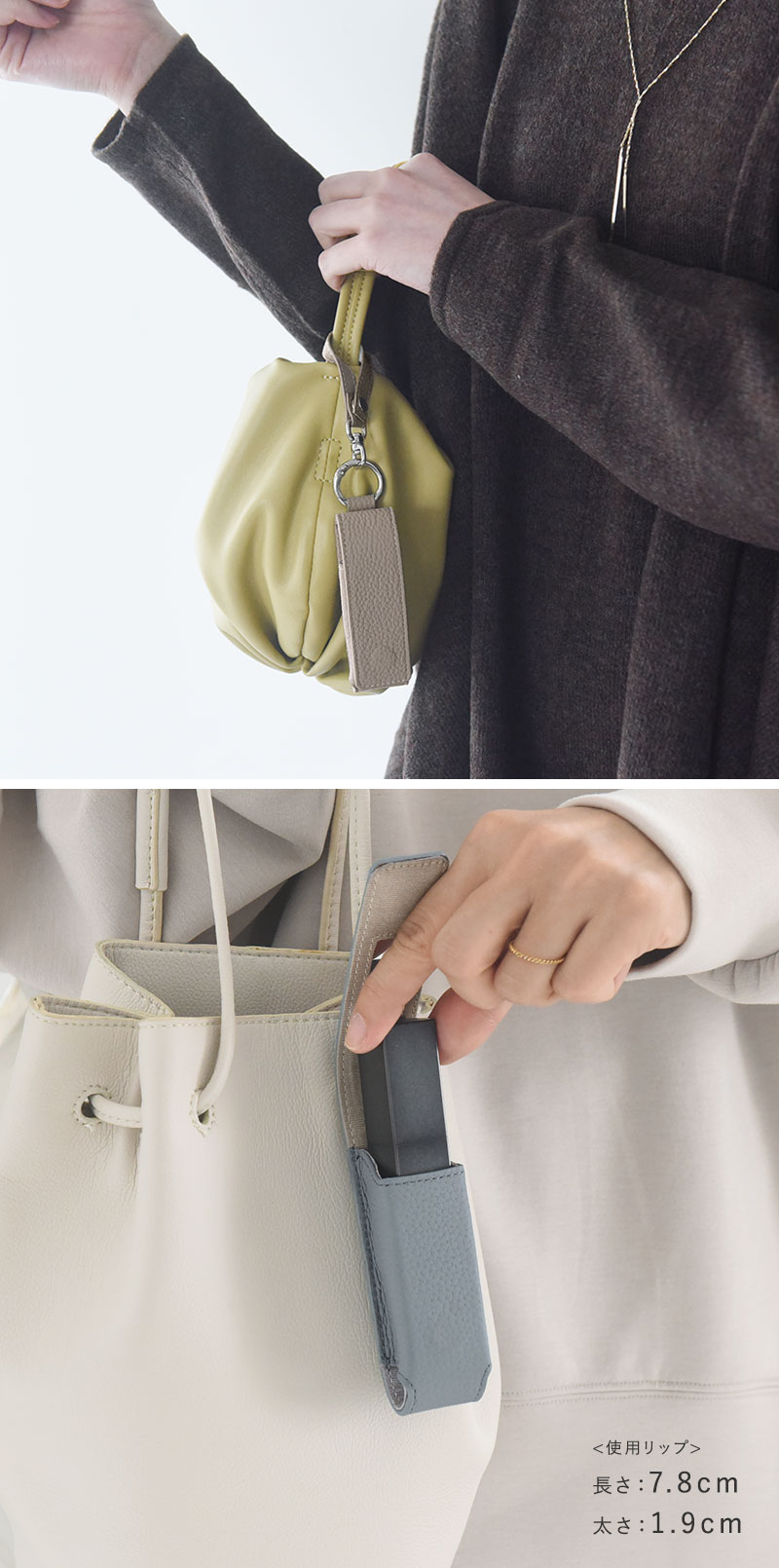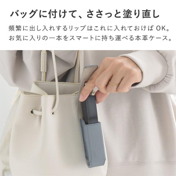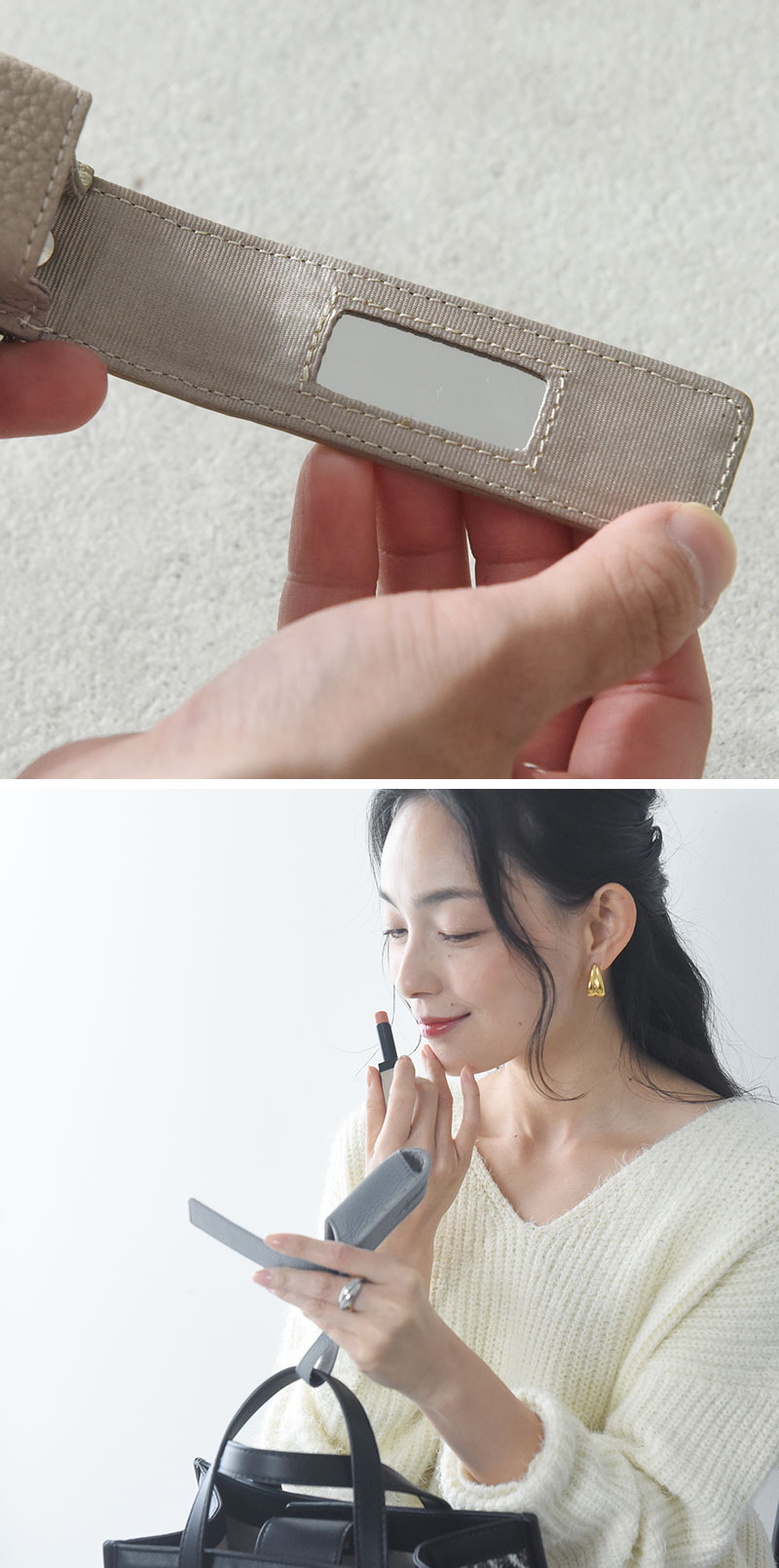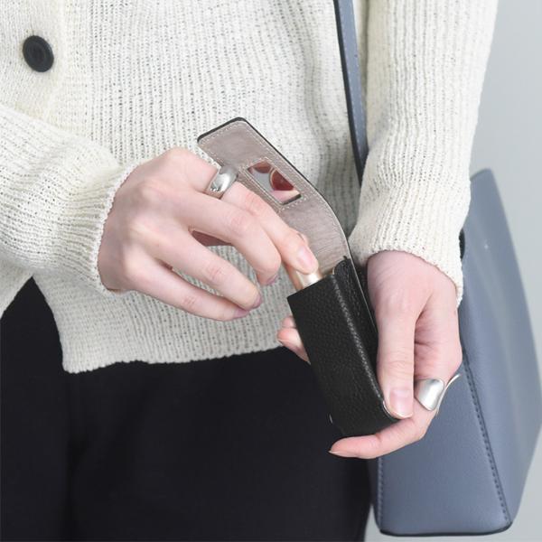 バッグに付けてサッとお直しができる牛革リップケース。リップが迷子になることなく、即座にお直しができます。また、内側にミラーが付いているのでその場で塗り直しも楽ちんです。