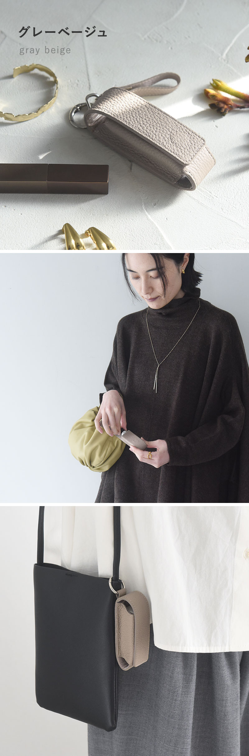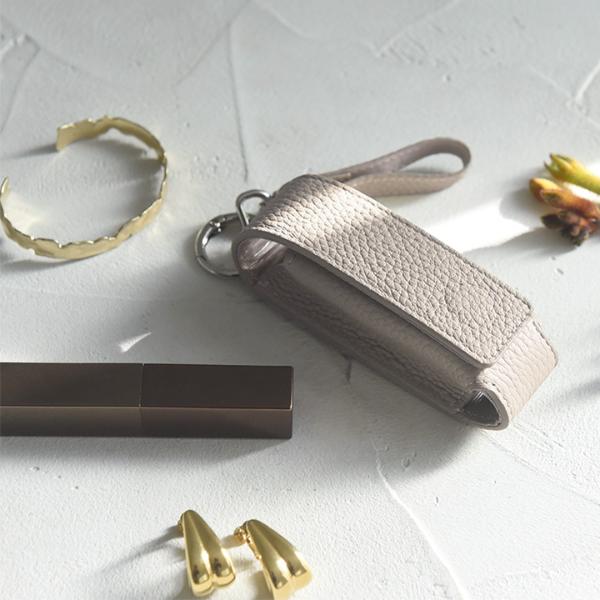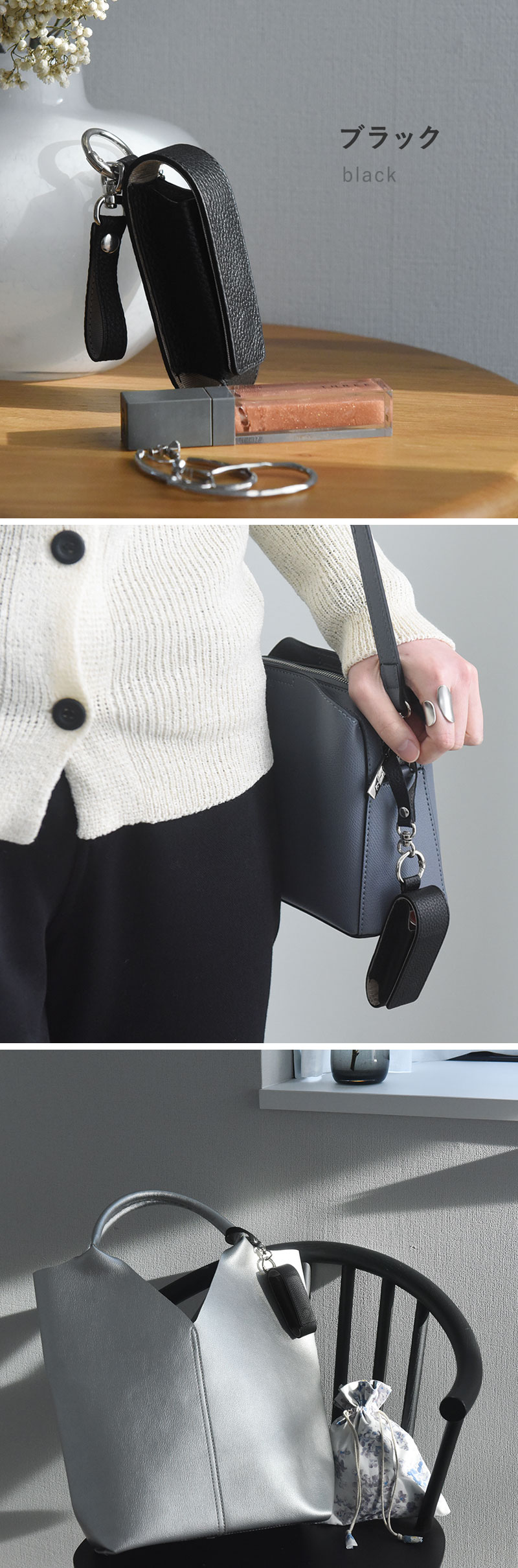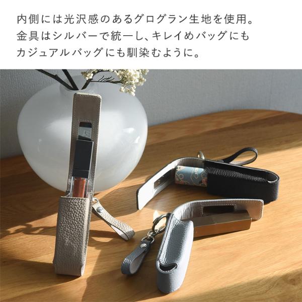 バッグに付けてサッとお直しができる牛革リップケース。リップが迷子になることなく、即座にお直しができます。また、内側にミラーが付いているのでその場で塗り直しも楽ちんです。