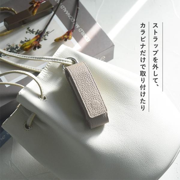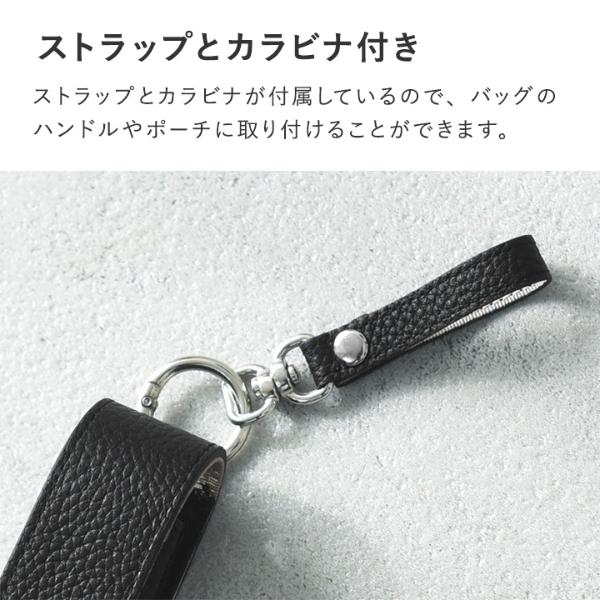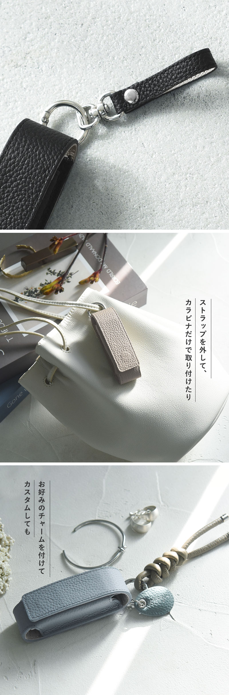 ストラップとカラビナが付属しているので、バッグのハンドルやポーチに取り付けることができます。ストラップを外してカラビナだけで取り付けたり、お好みのチャームを付けてカスタムするのも◎。