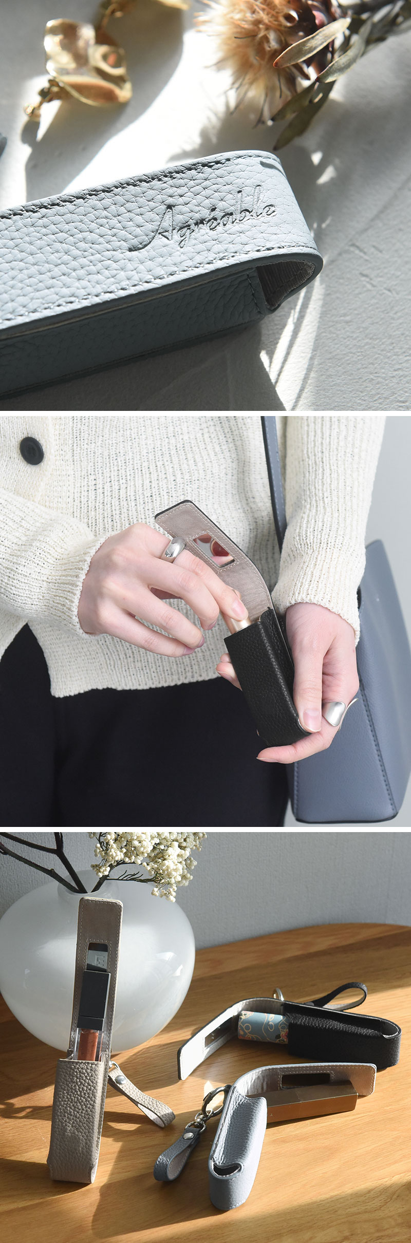 バッグに付けてさっとお直しできるミラー付 牛革 リップケース印鑑ケース/Agreable アグレアーブル