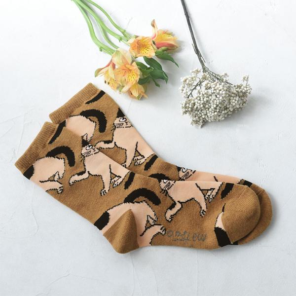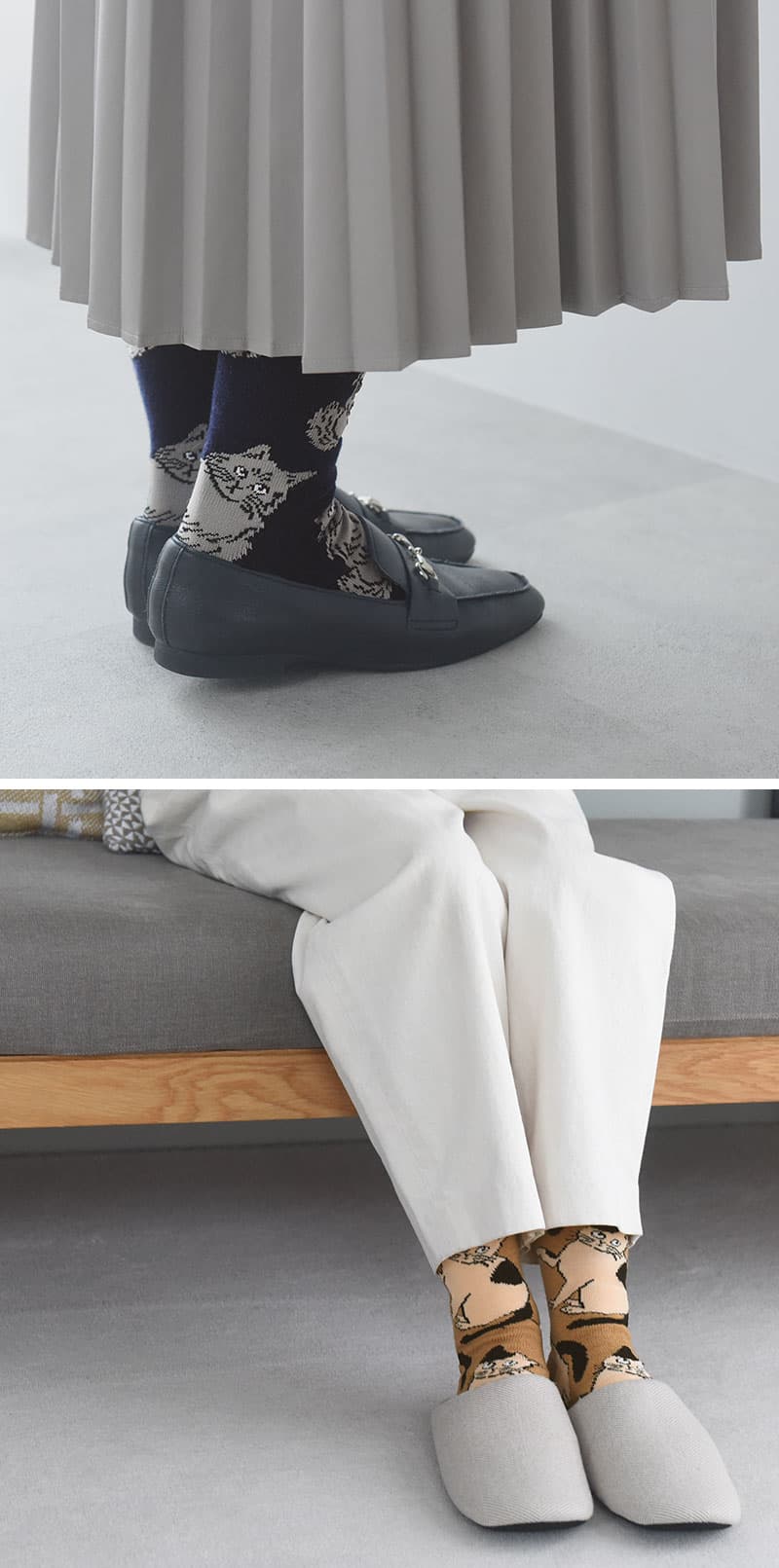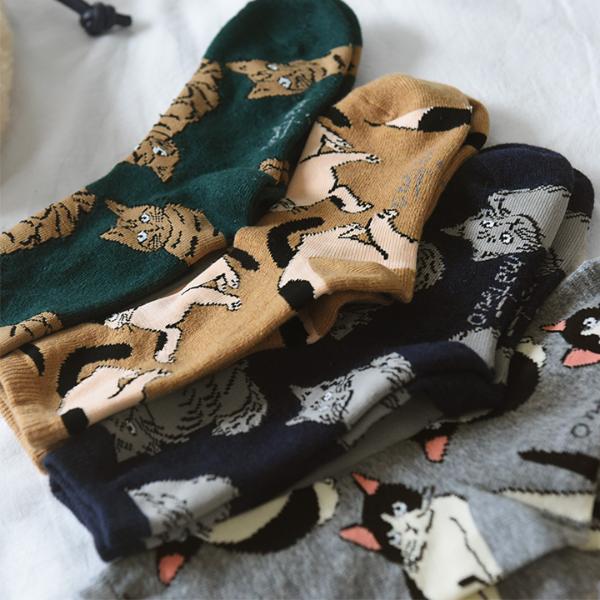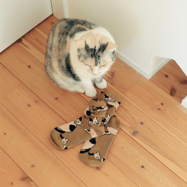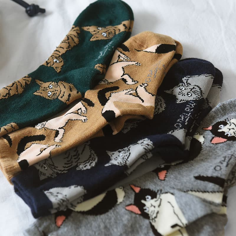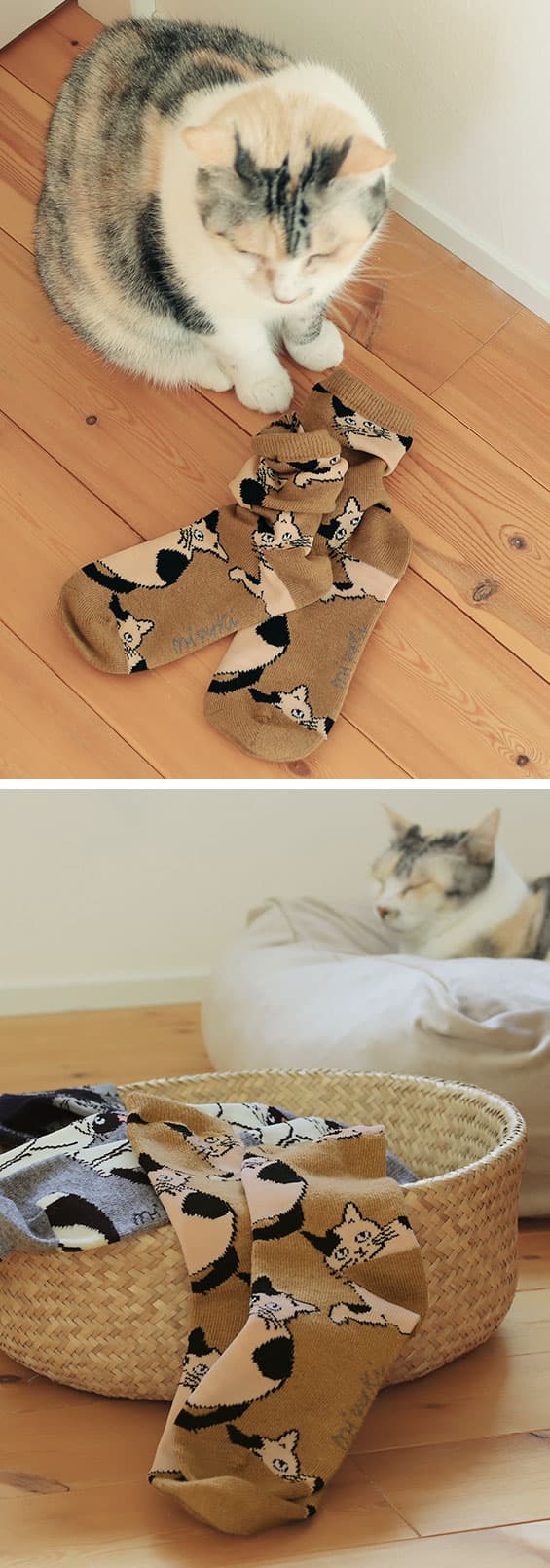 - 見るたびに気持ちがゆるむ靴下が届きました。ほっこり温かみのあるイラストは、松尾ミユキさんが描いたもの。はちわれさんに茶色のねこさんなど、4種類からお選びいただけます。