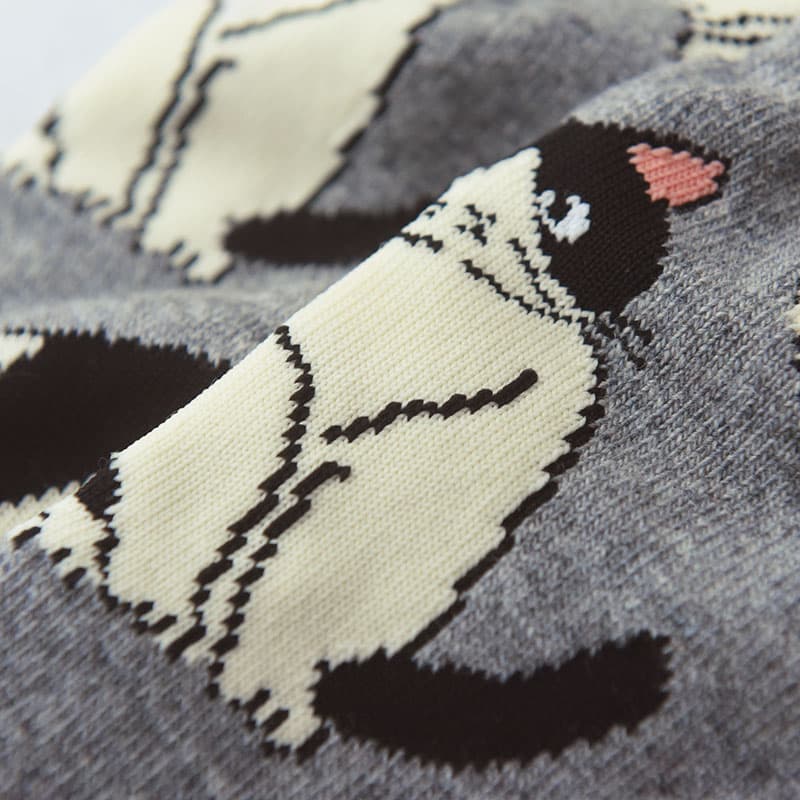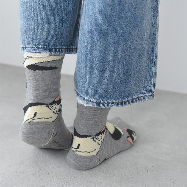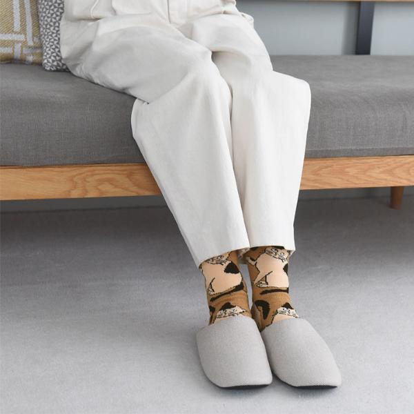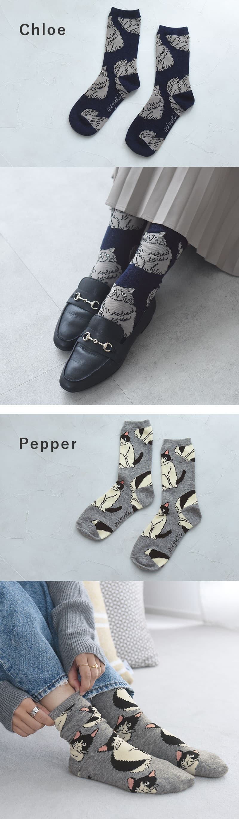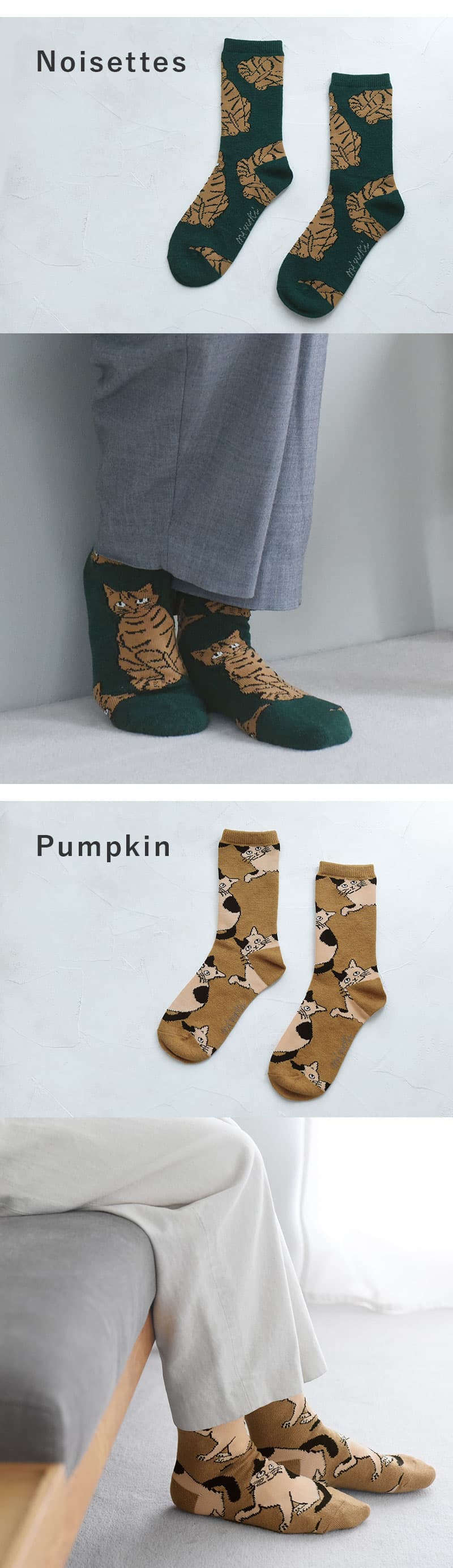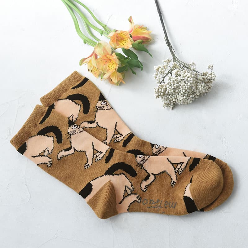 - 見るたびに気持ちがゆるむ靴下が届きました。ほっこり温かみのあるイラストは、松尾ミユキさんが描いたもの。はちわれさんに茶色のねこさんなど、4種類からお選びいただけます。