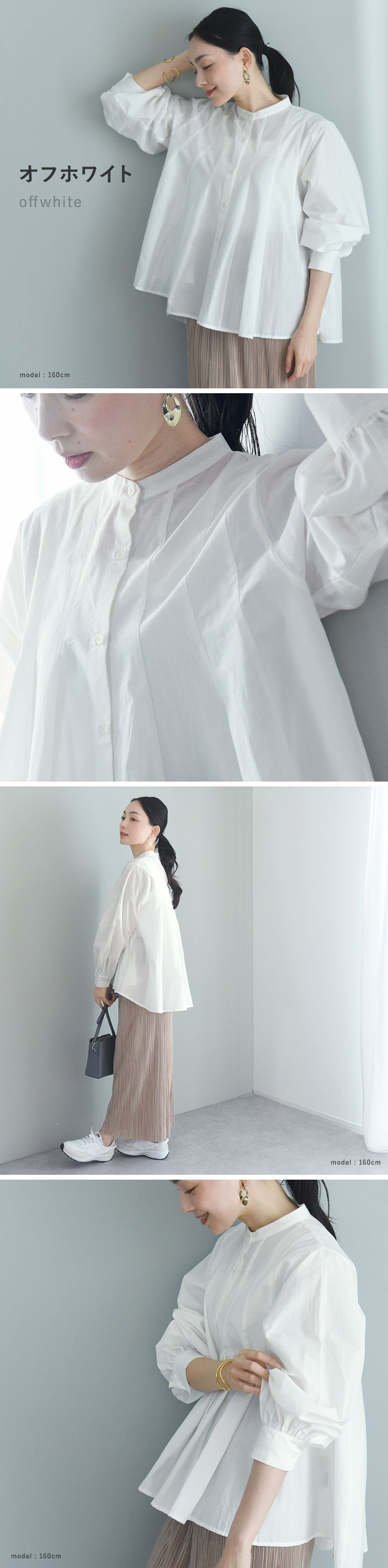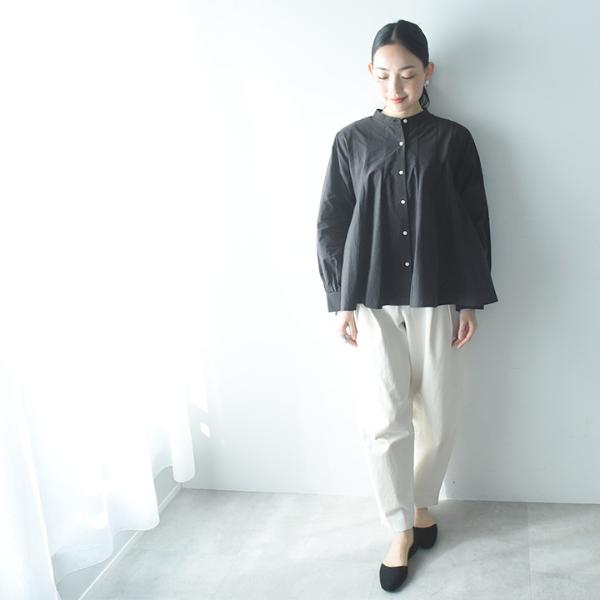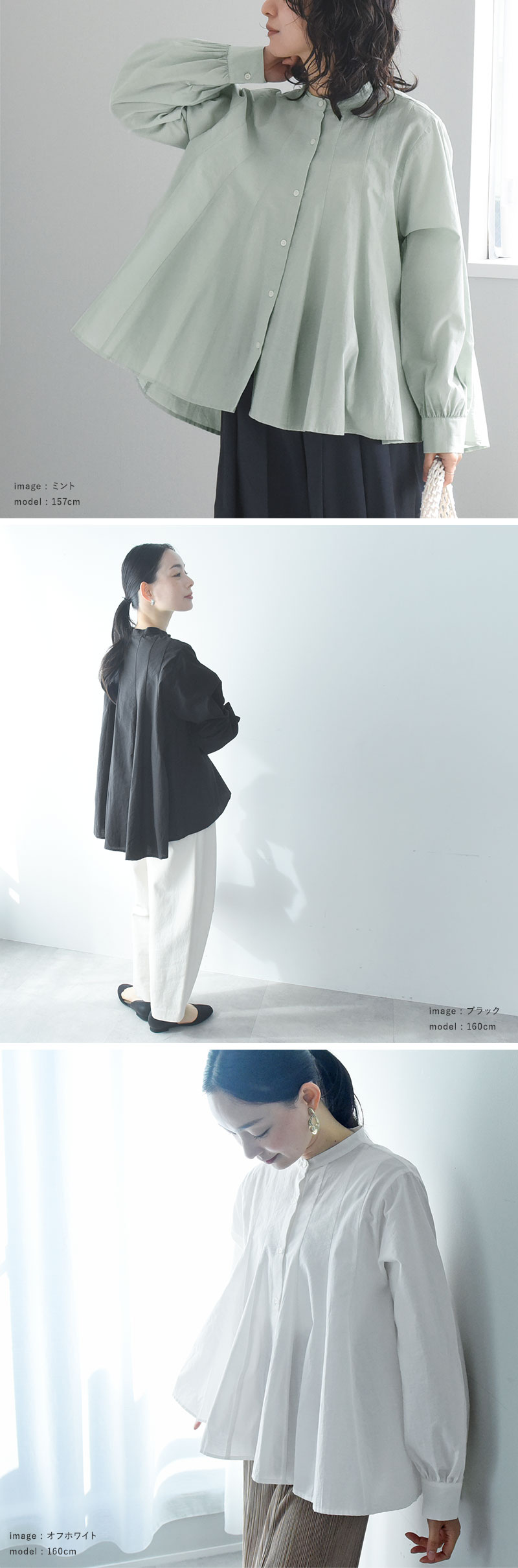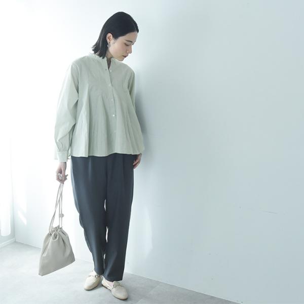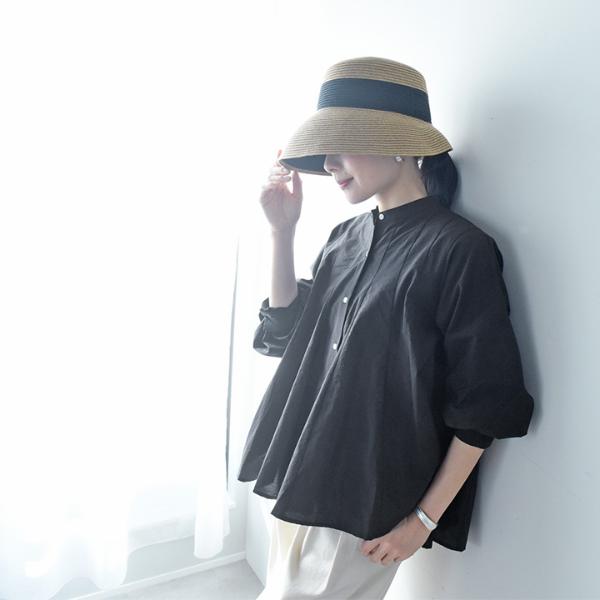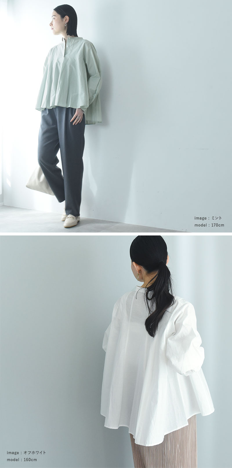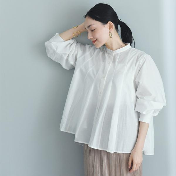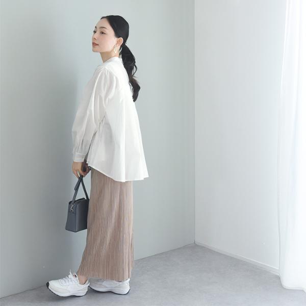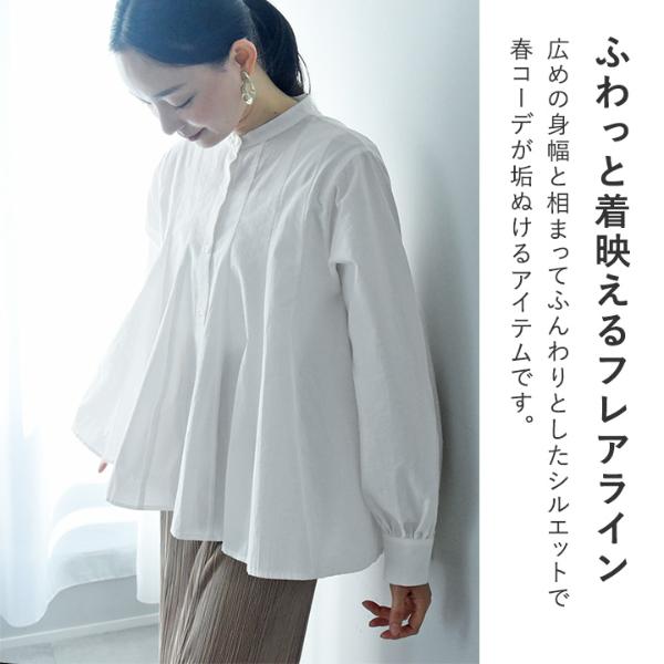- ウエストインせずともそのままで着映えるシルエット。裾がふわりと広がったフレアデザインですが、実は縦の切り替えラインで引き締め効果も。春の定番ブラウスです。