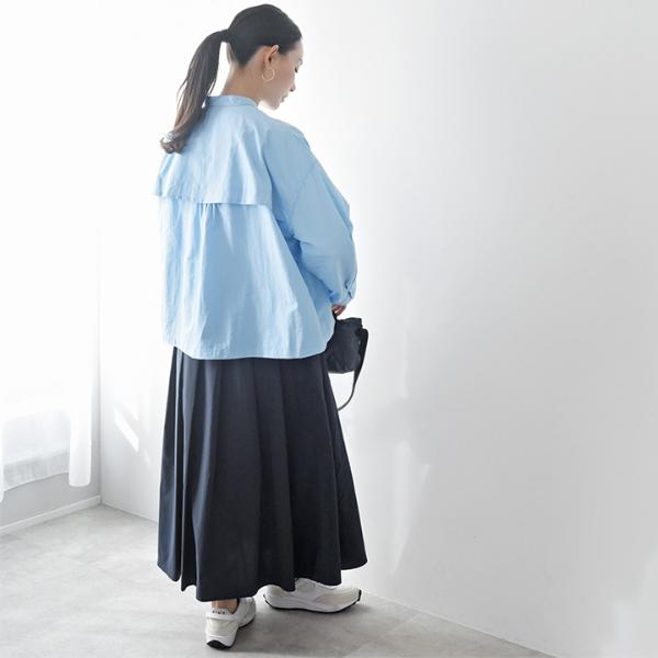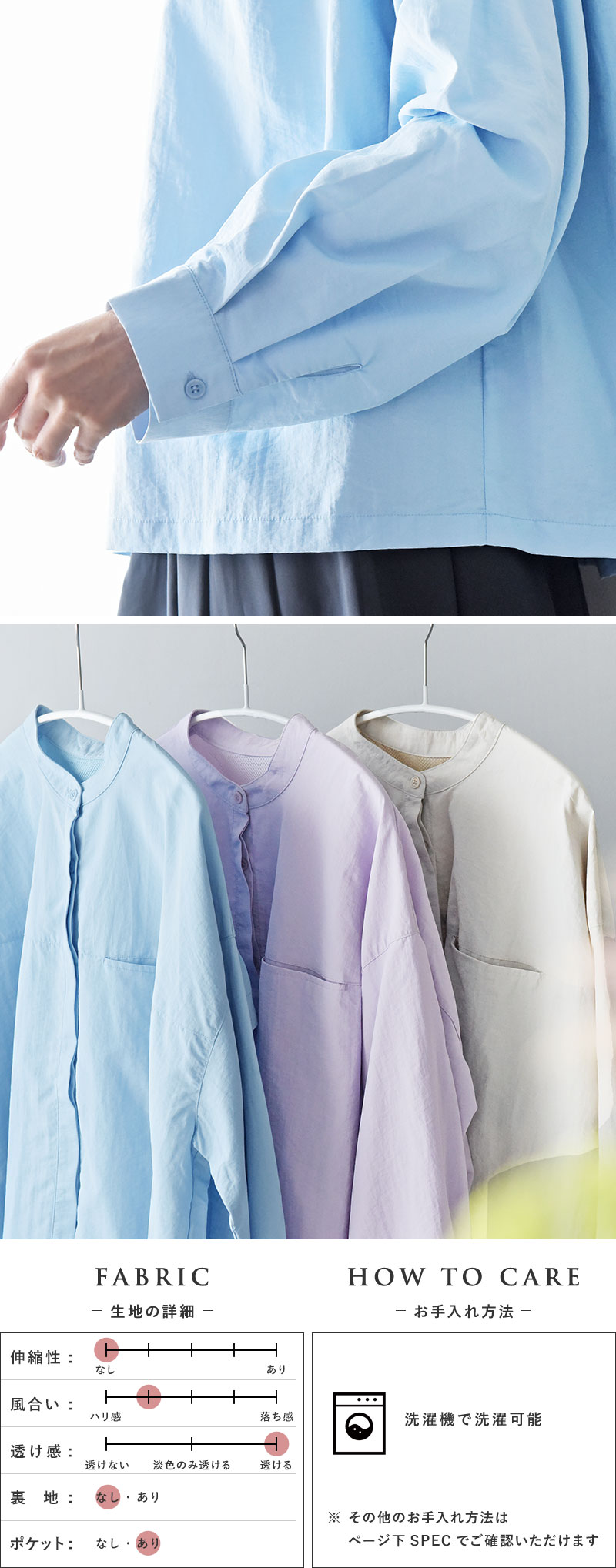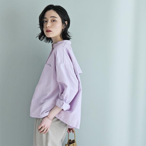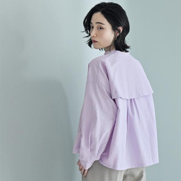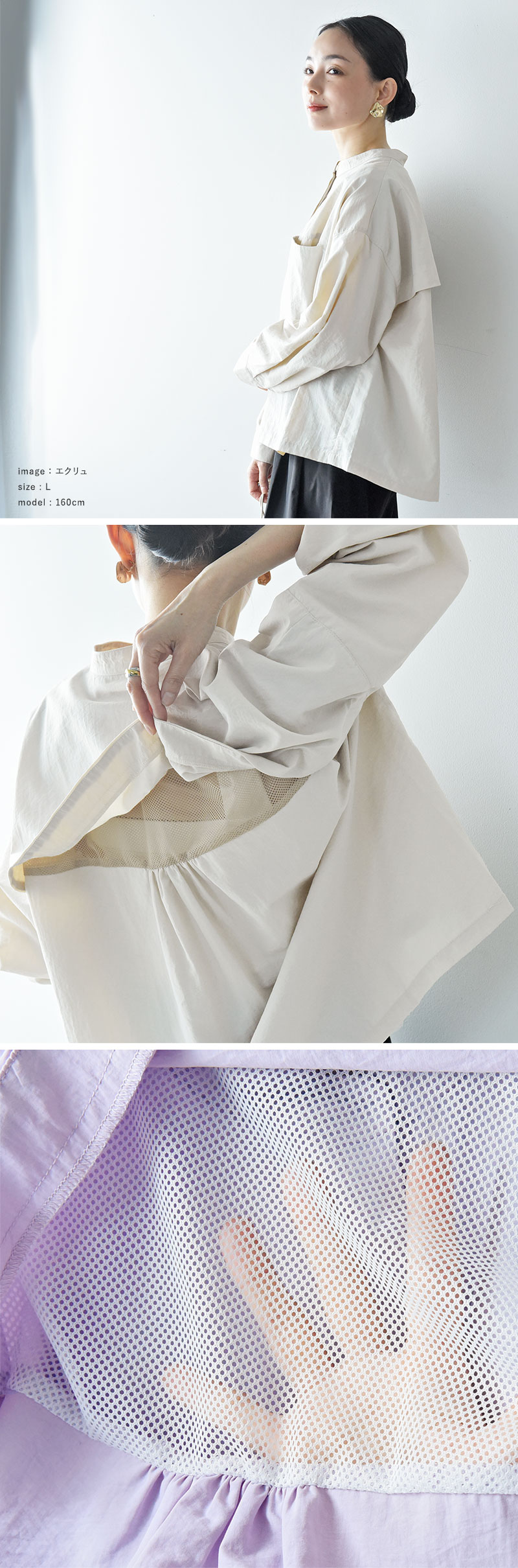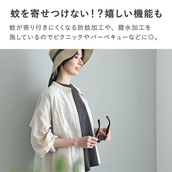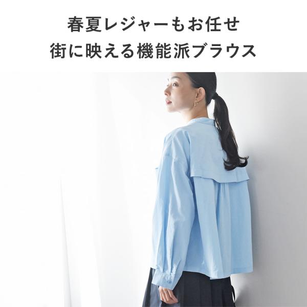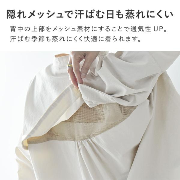 - 汗ばむ季節に嬉しい機能がついた、優しい彩りの春色ブラウス。背中の上部はメッシュにして蒸れにくく、防蚊や撥水加工も施されています。街歩きだけでなくレジャーにも頼れる一枚。