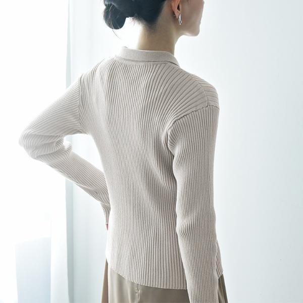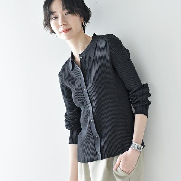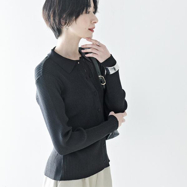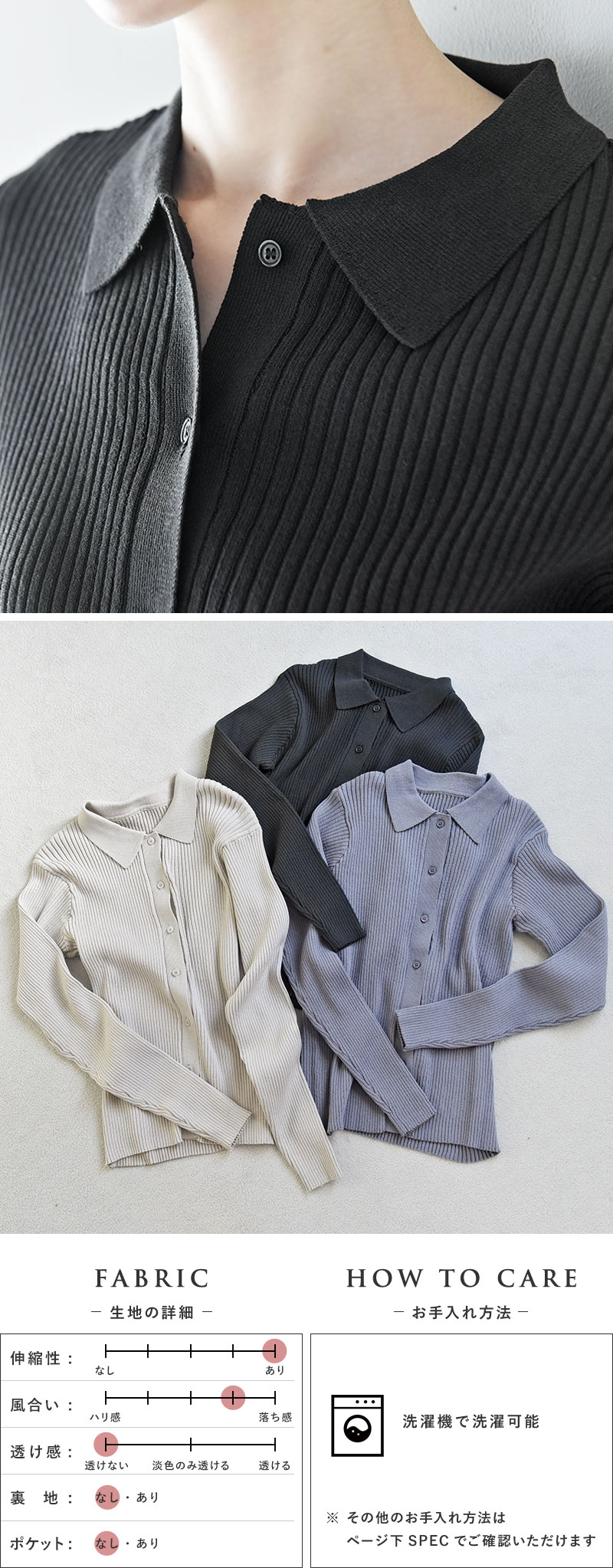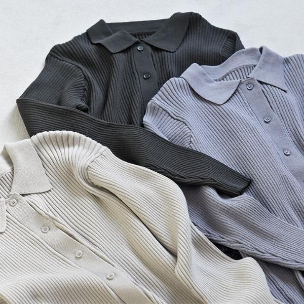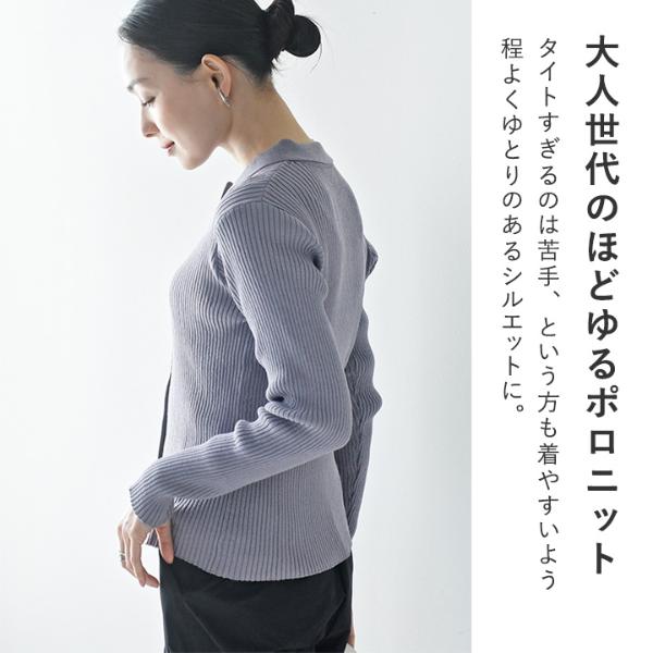 春や秋などにぴったりな生地感の、襟付きポロニット。伸縮性が高く、洗濯機で洗えて毛玉が出来にくいので毎日のお手入れもラクチンです。お仕事コーデにも合うきちんと感です。