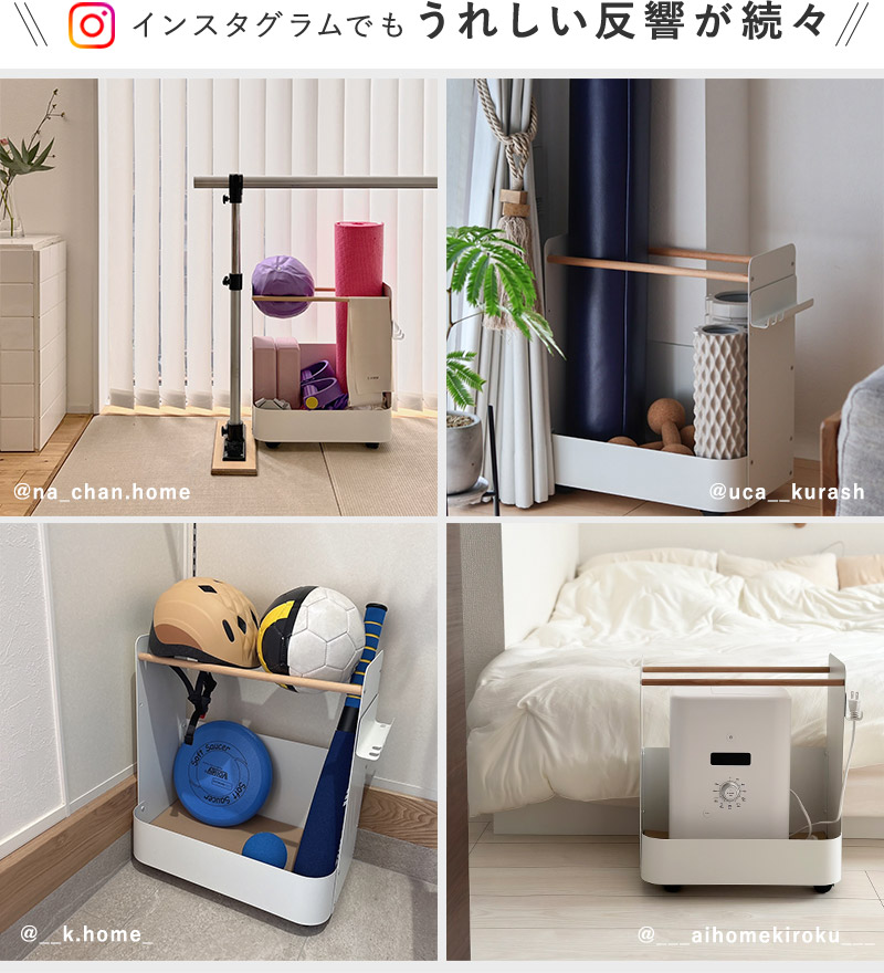 ヨガマットはもちろん、フォームローラーやストレッチボールなどもまとめて置いておけるくらい、収納力はしっかり。押し入れの奥にしまいこんでいたモノも一緒にしまえそうです。