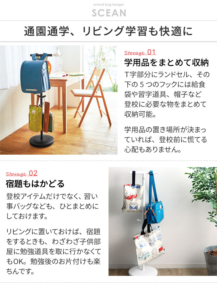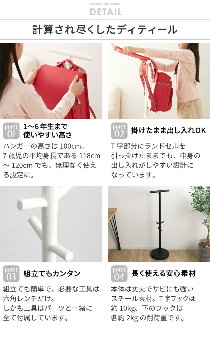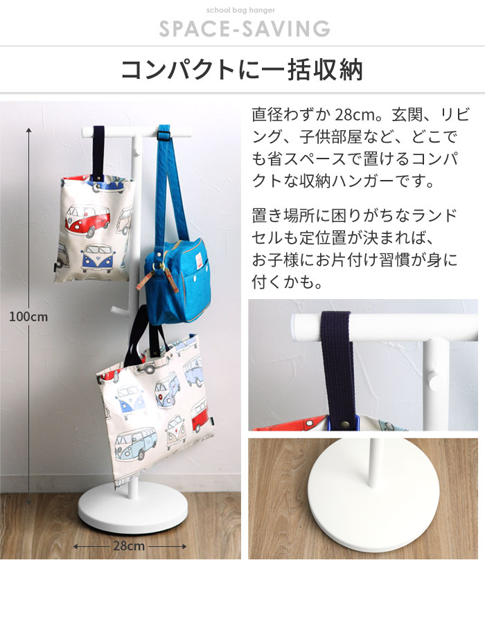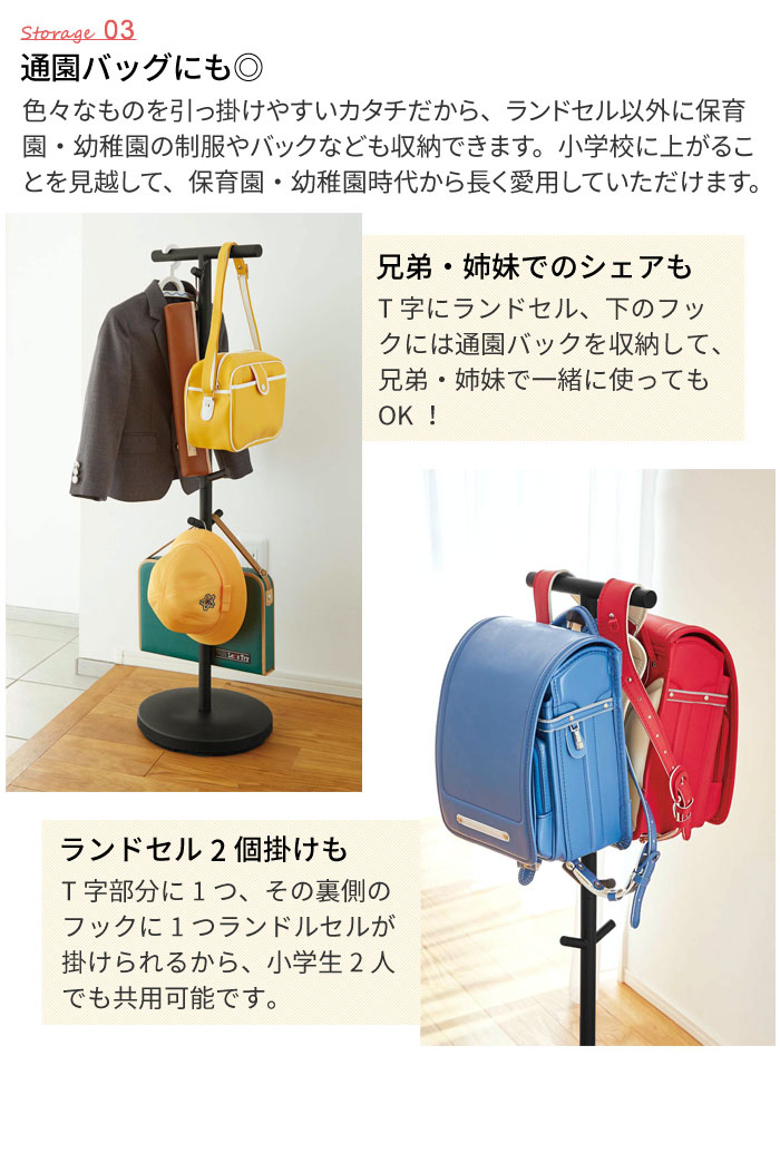 - 子供部屋はモチロン、玄関やリビングに置いておけば、ランドセルや給食袋、通園バッグやおけいこバッグなどを気軽にかけられるハンガーです。リビング学習の荷物おきとしても◎