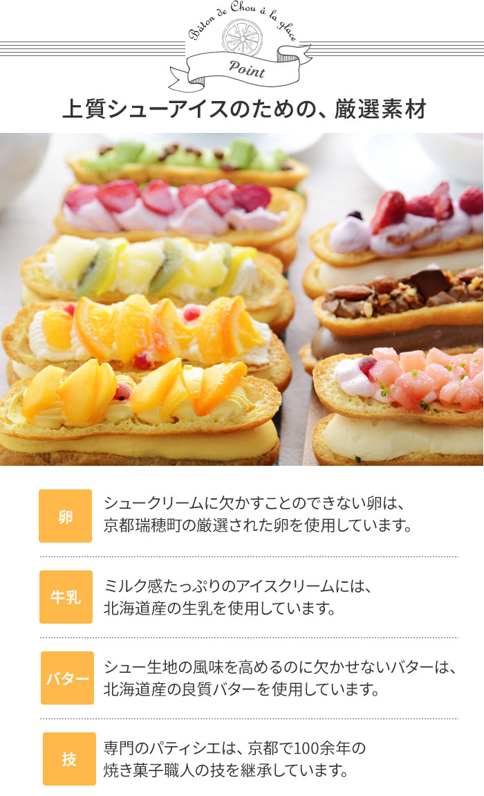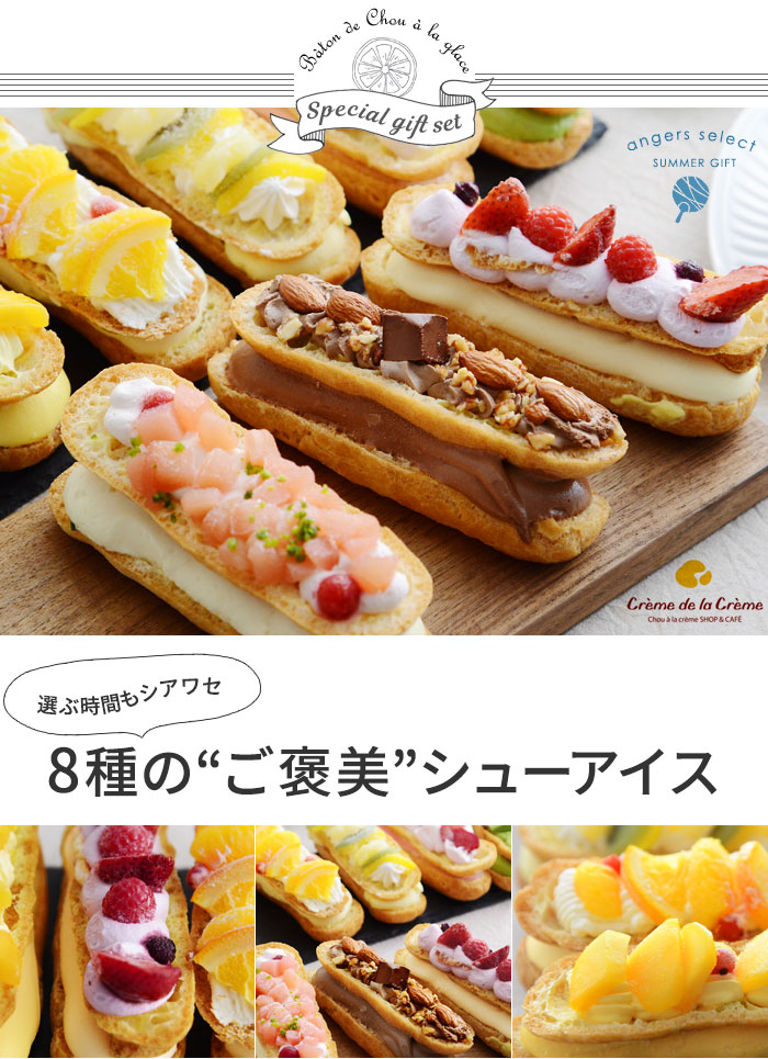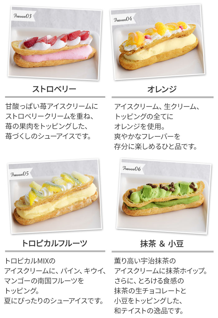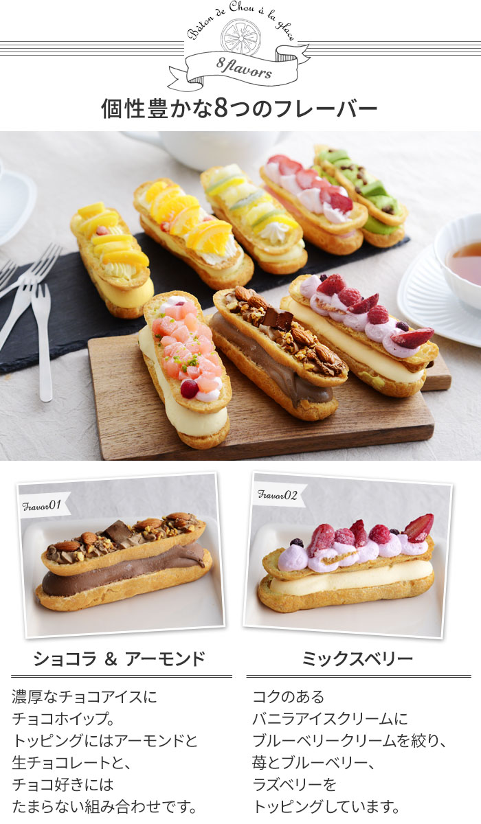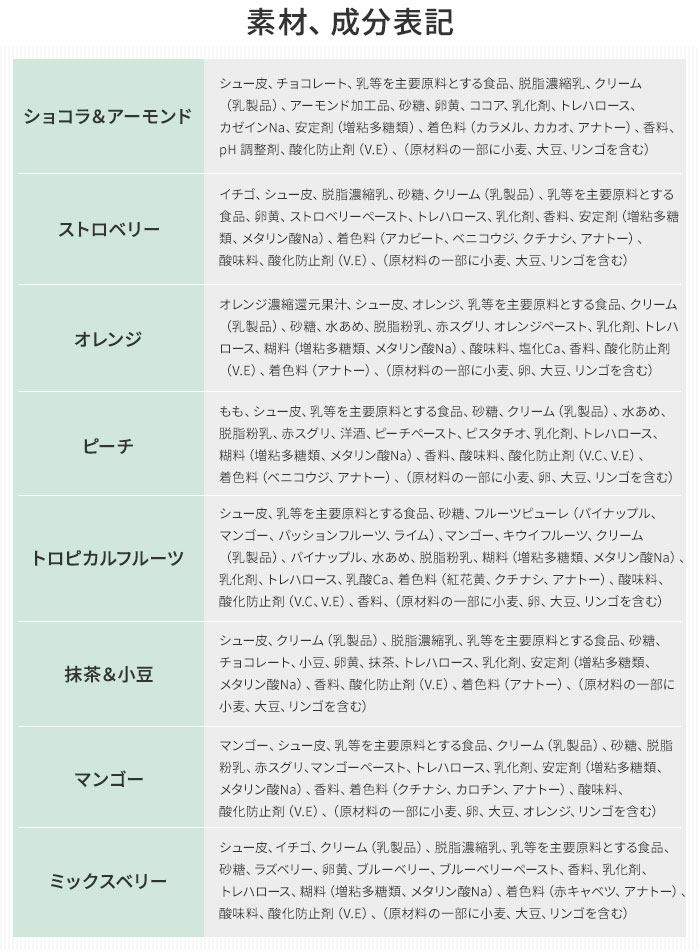 内容量:(ミックスベリー、トロピカルフルーツ、オレンジ、ショコラ&アーモンド、ストロベリー、マンゴー、抹茶&小豆、ピーチ)各1個