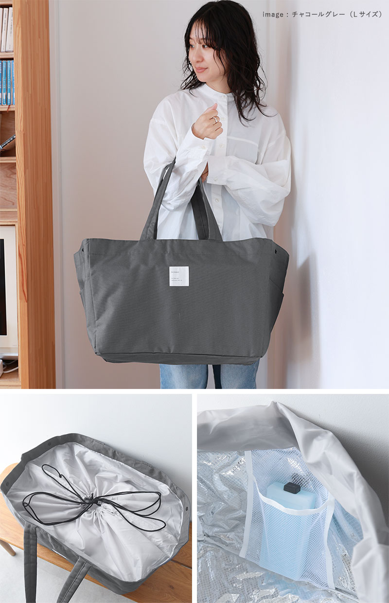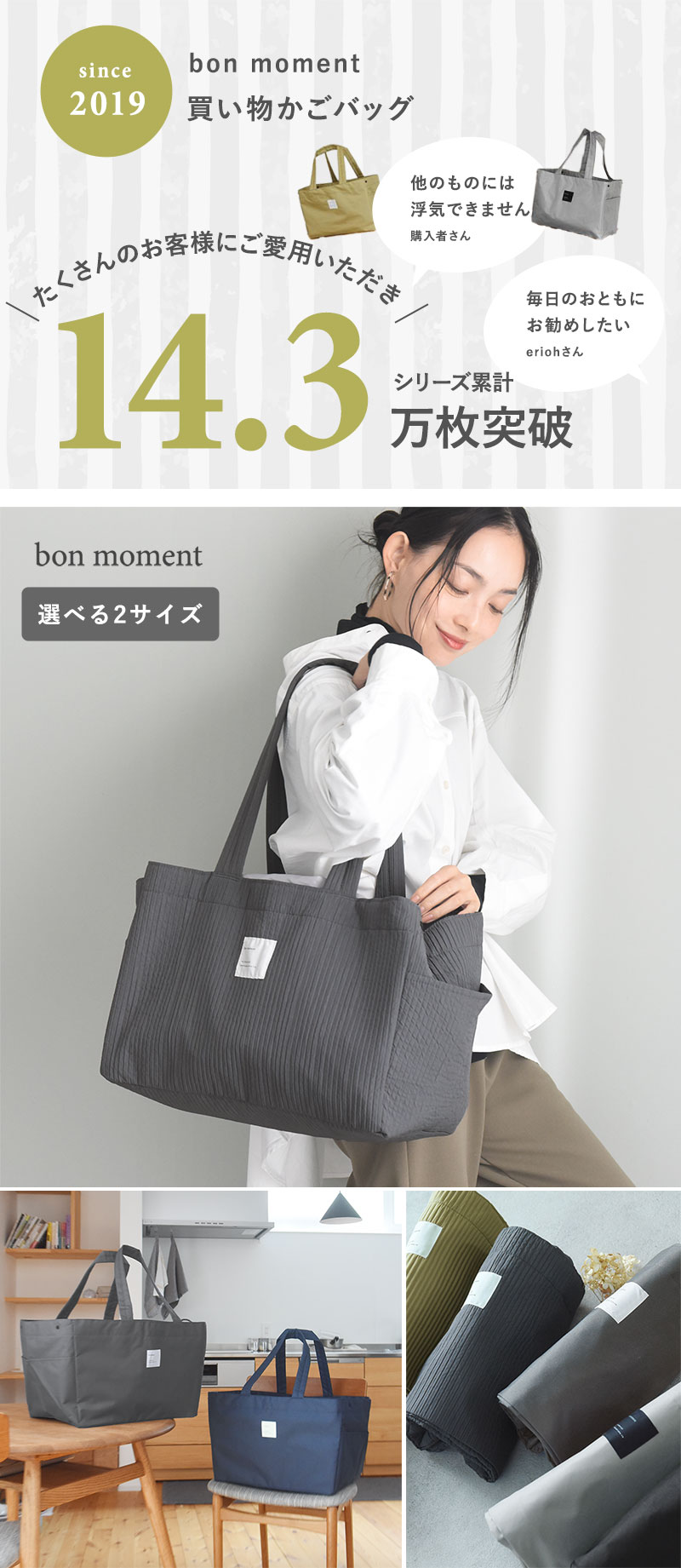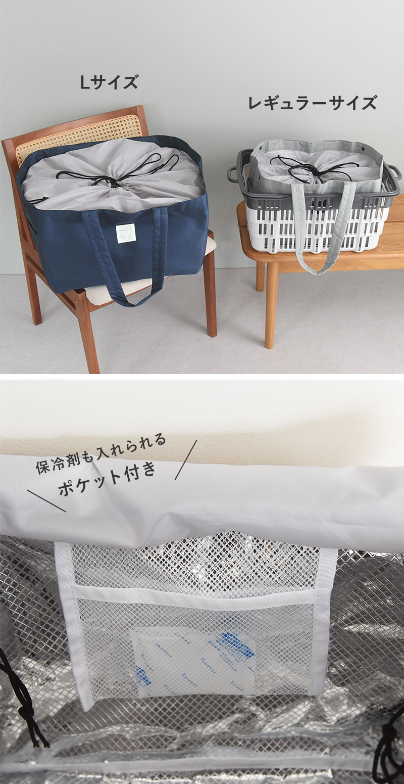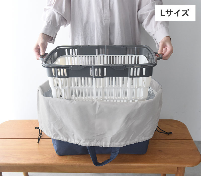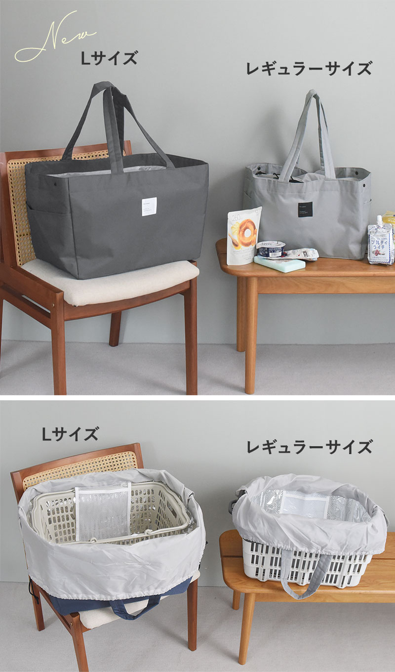 スーパーのカゴにぴったりフィットする、マチのある大容量のバッグです。カゴに収まるレギュラーサイズと、カゴをまるっと入れられるLサイズの2サイズ展開。口部分は巾着仕様なので、たくさん物を詰めても溢れず、目隠しとしても活躍します。