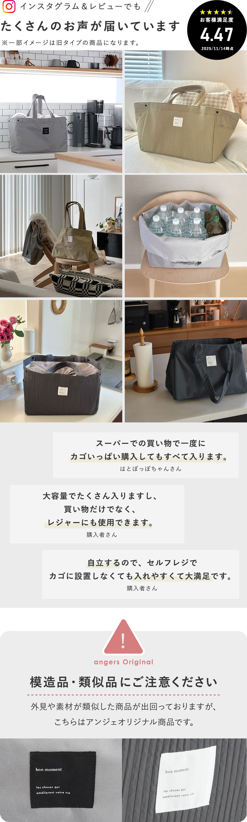 • 皆さんのレビューがよいので、使っていたレジカゴバックがへったってきたことを機に買い替えました。しっかりした生地なので、たたむとき少しコツがいりますが、慣れようと思います。頑丈さとお洒落が両立したバック。