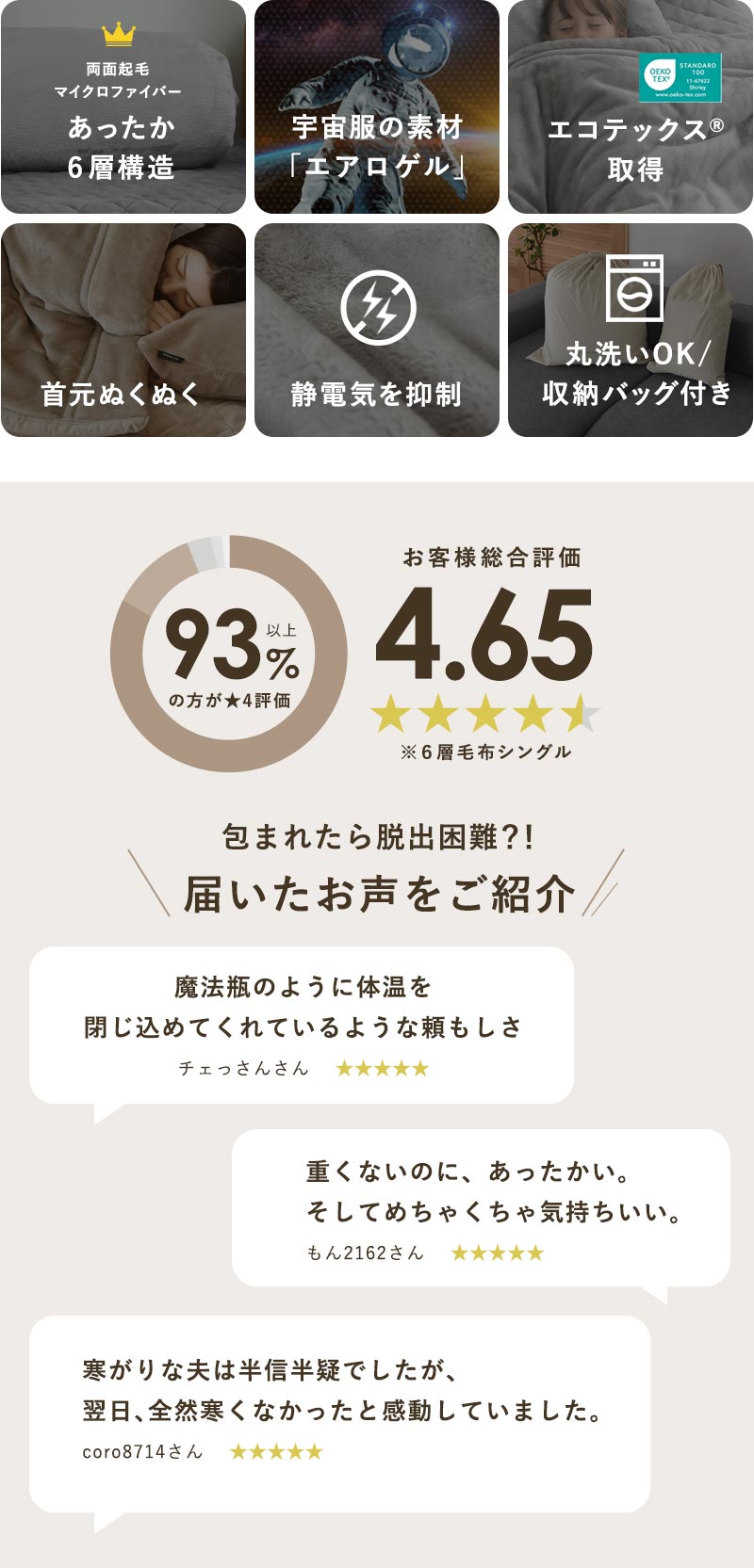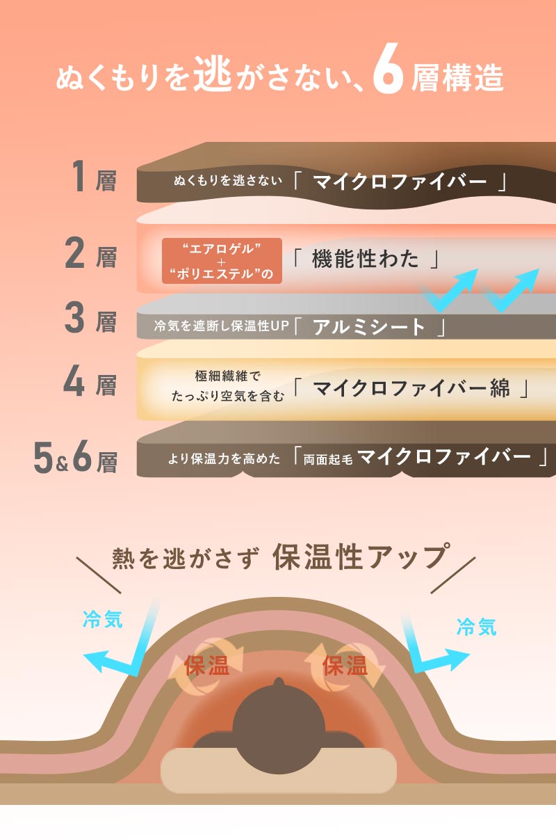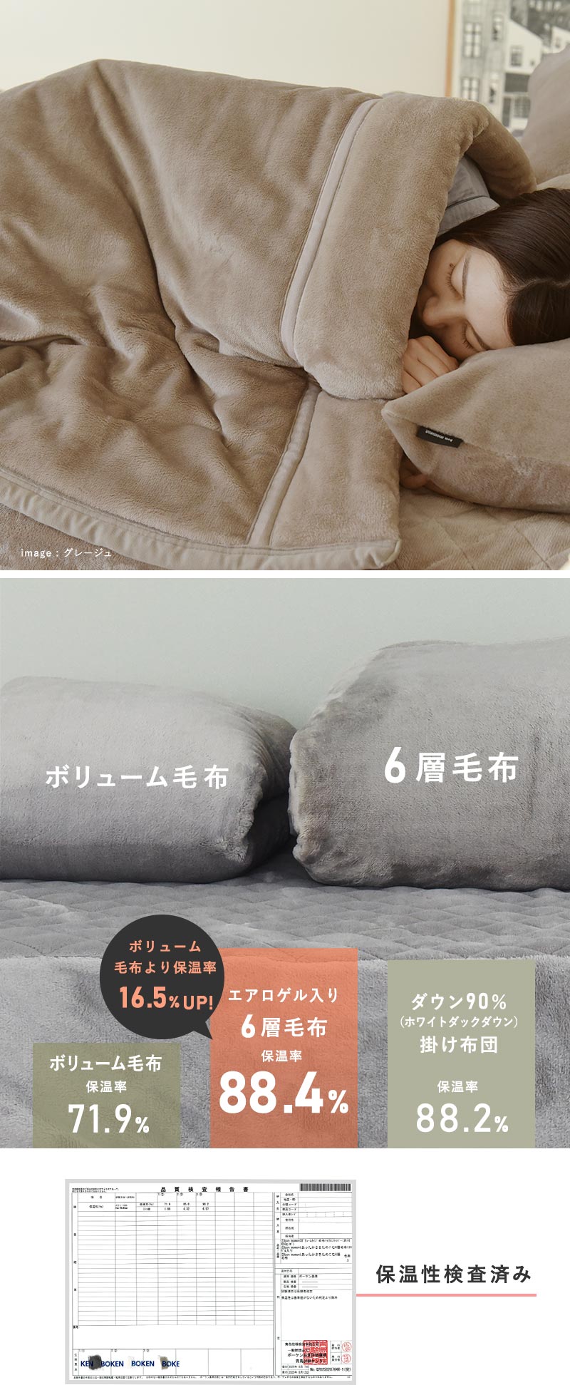 ぬくもりをぎゅっと閉じ込める6層構造に、宇宙服にも使われる断熱材“エアロゲル”入り。寒い冬も毛布を重ねることなく、これ一枚で抜群のあたたかさを感じていただけます。