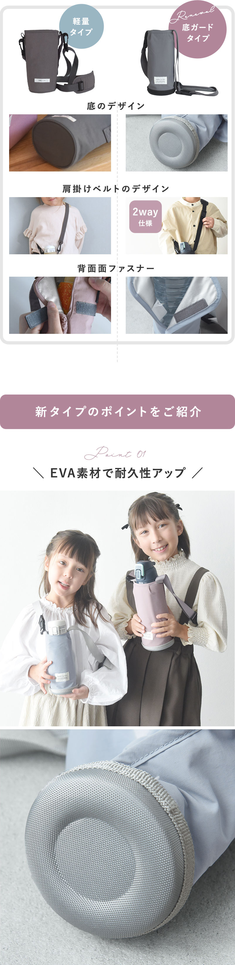Point1:水筒の傷付きをしっかり守る本体には中綿素材の保冷シート、底面にはEVA素材を入れることで、水筒本体をしっかり傷から守ってくれます。