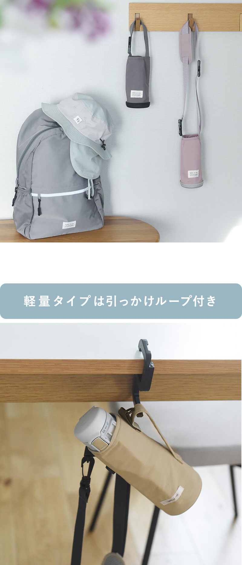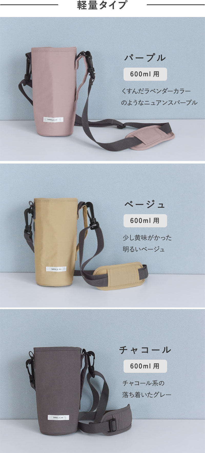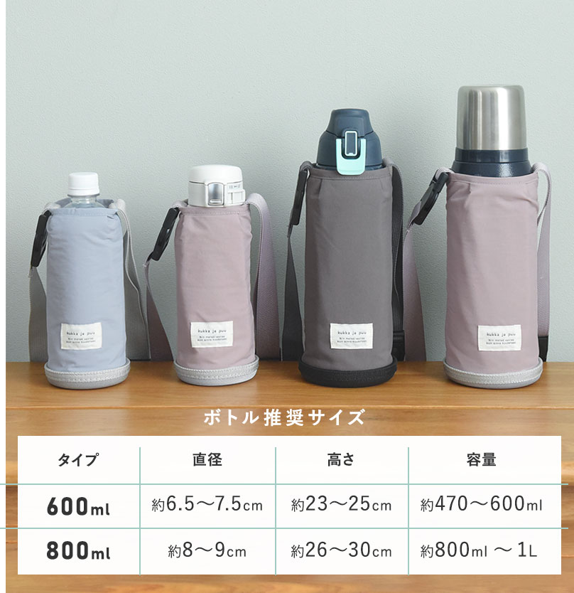 - 北欧ライクな無地のニュアンスカラー、シンプルデザインの水筒カバー。ボトルに合わせてサイズ調整も可能。保冷素材なので、ペットボトルにも対応しています。