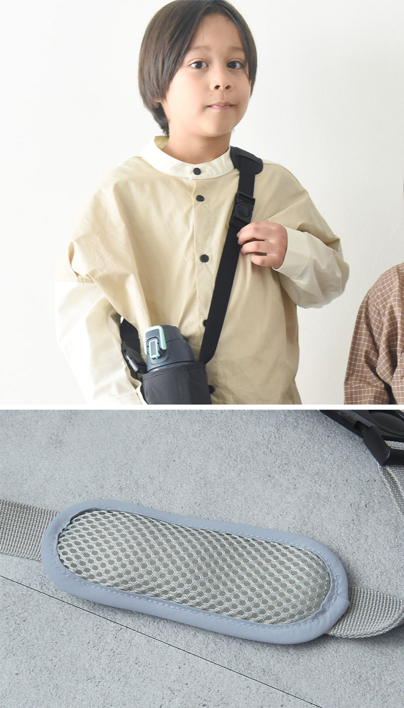 3層構造(表地/合皮シート/立体メッシュ素材)で、お子様の肩への負担を和らげてくれます。